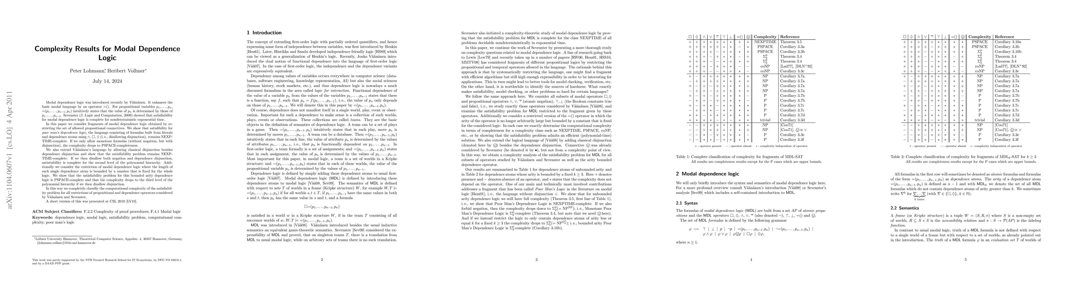 Modal dependence logic was introduced recently by V\"a\"an\"anen. It enhances the basic modal language by an operator =(). For propositional variables p_1,...,p_n, =(p_1,...,p_(n-1);p_n) intuitively states that the value of p_n is determined by those of p_1,...,p_(n-1). Sevenster (J. Logic and Computation, 2009) showed that satisfiability for modal dependence logic is complete for nondeterministic exponential time. In this paper we consider fragments of modal dependence logic obtained by restricting the set of allowed propositional connectives. We show that satisfibility for poor man's dependence logic, the language consisting of formulas built from literals and dependence atoms using conjunction, necessity and possibility (i.e., disallowing disjunction), remains NEXPTIME-complete. If we only allow monotone formulas (without negation, but with disjunction), the complexity drops to PSPACE-completeness. We also extend V\"a\"an\"anen's language by allowing classical disjunction besides dependence disjunction and show that the satisfiability problem remains NEXPTIME-complete. If we then disallow both negation and dependence disjunction, satistiability is complete for the second level of the polynomial hierarchy. In this way we completely classify the computational complexity of the satisfiability problem for all restrictions of propositional and dependence operators considered by V\"a\"an\"anen and Sevenster.