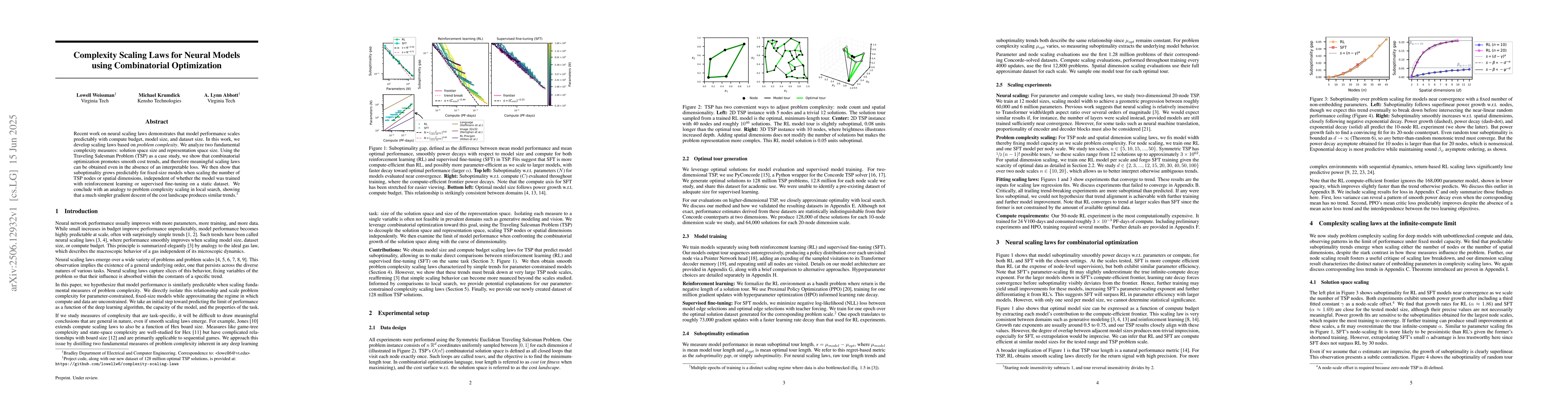 This research develops scaling laws for neural models based on problem complexity, specifically focusing on solution and representation space sizes. Using the Traveling Salesman Problem (TSP), it demonstrates smooth cost trends allowing for meaningful scaling laws, even without an interpretable loss. Suboptimality growth for fixed-size models was shown to scale predictably with problem size, independent of training method. The findings suggest similarities to local search problem complexity scaling, indicating simpler optimization methods can yield comparable trends.