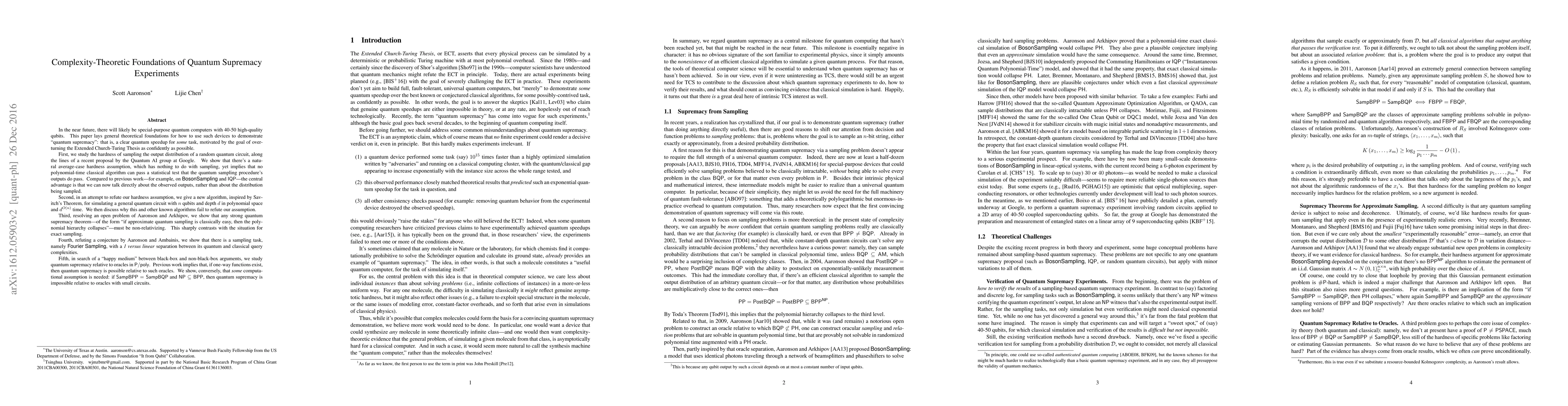 This paper establishes theoretical foundations for demonstrating quantum supremacy using near-future quantum computers with 40-50 qubits. It introduces a new hardness assumption implying no efficient classical algorithm can pass a statistical test for quantum sampling outputs, and discusses why known algorithms fail to refute this assumption. It also resolves open problems regarding the non-relativizing nature of quantum supremacy theorems and the separation between quantum and randomized query complexities for the Fourier Sampling problem.