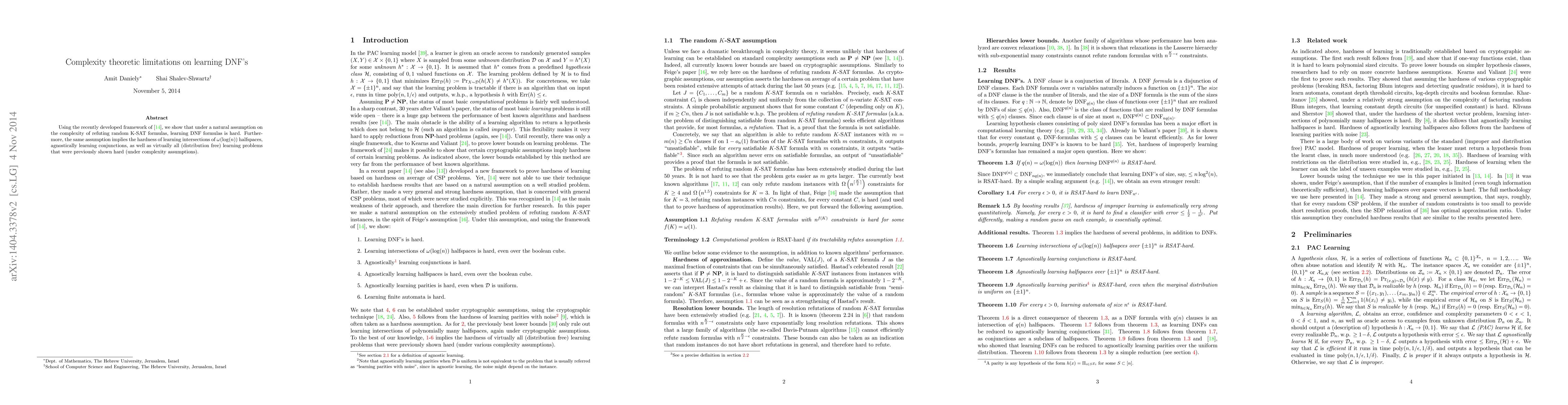 Using the recently developed framework of [Daniely et al, 2014], we show that under a natural assumption on the complexity of refuting random K-SAT formulas, learning DNF formulas is hard. Furthermore, the same assumption implies the hardness of learning intersections of $\omega(\log(n))$ halfspaces, agnostically learning conjunctions, as well as virtually all (distribution free) learning problems that were previously shown hard (under complexity assumptions).