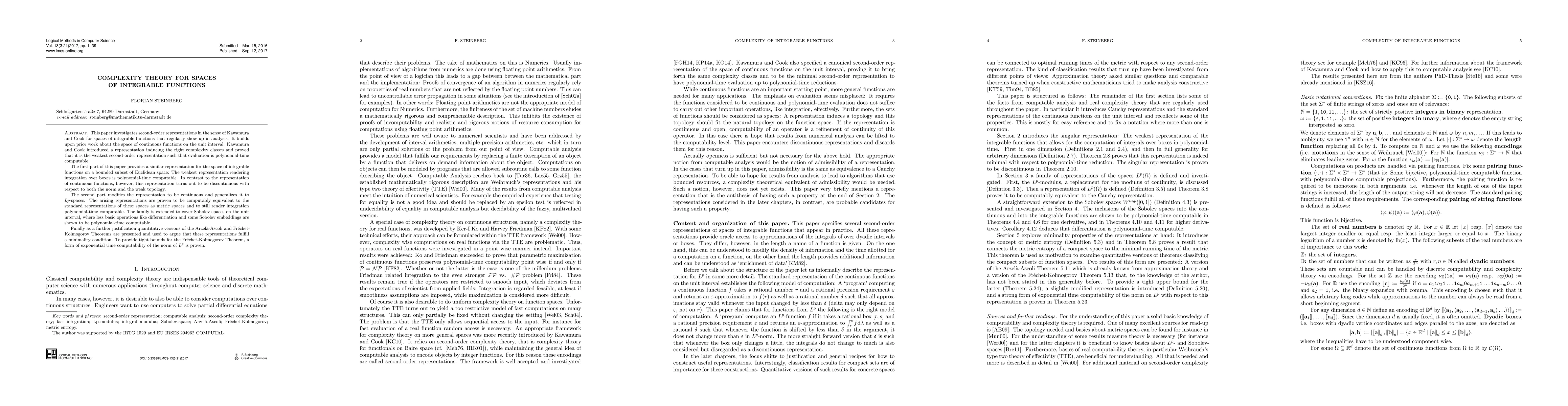 This paper investigates second-order representations in the sense of Kawamura and Cook for spaces of integrable functions that regularly show up in analysis. It builds upon prior work about the space of continuous functions on the unit interval: Kawamura and Cook introduced a representation inducing the right complexity classes and proved that it is the weakest second-order representation such that evaluation is polynomial-time computable. The first part of this paper provides a similar representation for the space of integrable functions on a bounded subset of Euclidean space: The weakest representation rendering integration over boxes is polynomial-time computable. In contrast to the representation of continuous functions, however, this representation turns out to be discontinuous with respect to both the norm and the weak topology. The second part modifies the representation to be continuous and generalizes it to Lp-spaces. The arising representations are proven to be computably equivalent to the standard representations of these spaces as metric spaces and to still render integration polynomial-time computable. The family is extended to cover Sobolev spaces on the unit interval, where less basic operations like differentiation and some Sobolev embeddings are shown to be polynomial-time computable. Finally as a further justification quantitative versions of the Arzel\`a-Ascoli and Fr\'echet-Kolmogorov Theorems are presented and used to argue that these representations fulfill a minimality condition. To provide tight bounds for the Fr\'echet-Kolmogorov Theorem, a form of exponential time computability of the norm of Lp is proven.
