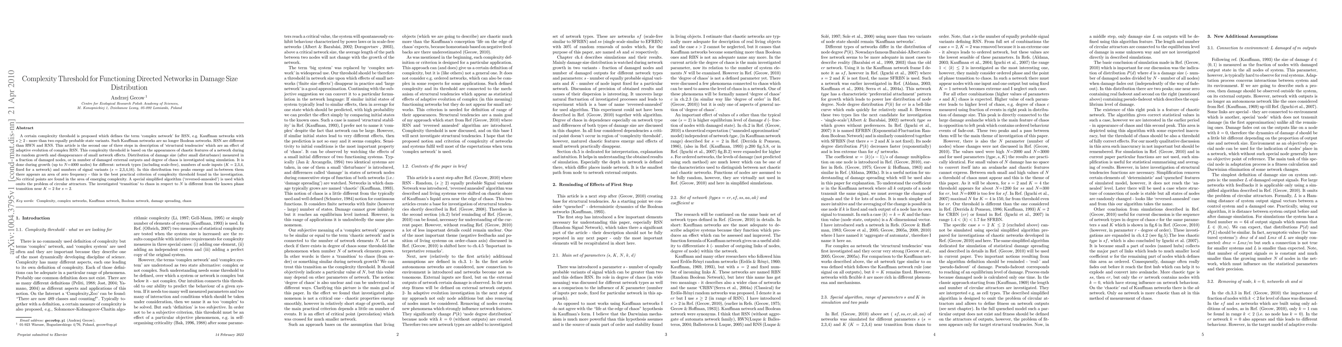 A certain complexity threshold is proposed which defines the term `complex network' for RSN, e.g. Kauffman networks with s>=2 - more than two equally probable state variants. Such Kauffman networks are no longer Boolean networks. RSN are different than RWN and RNS. This article is the second one of three steps in description of `structural tendencies' which are an effect of adaptive evolution of complex RSN. This complexity threshold is based on the appearances of chaotic features of a network during its random growth and disappearance of small network effects. Distribution of damage size (after small disturbance) measured in a fraction of damaged nodes, or in number of damaged external outputs and degree of chaos is investigated using simulation. It is done during growth (up to N=4000 nodes) for different: network types (including scale-free), numbers of node inputs (K=2,3,4, fixed for a network) and numbers of signal variants (s=2,3,4,16). In this distribution two peaks emerge and in-between them there appears an area of zero frequency - this is the best practical criterion of complexity threshold found in the investigation. No critical points are found in the area of emerging complexity. A special simplified algorithm (`reversed-annealed') is used which omits the problem of circular attractors. The investigated `transition' to chaos in respect to N is different from the known phase transition near K=2 for s=2.