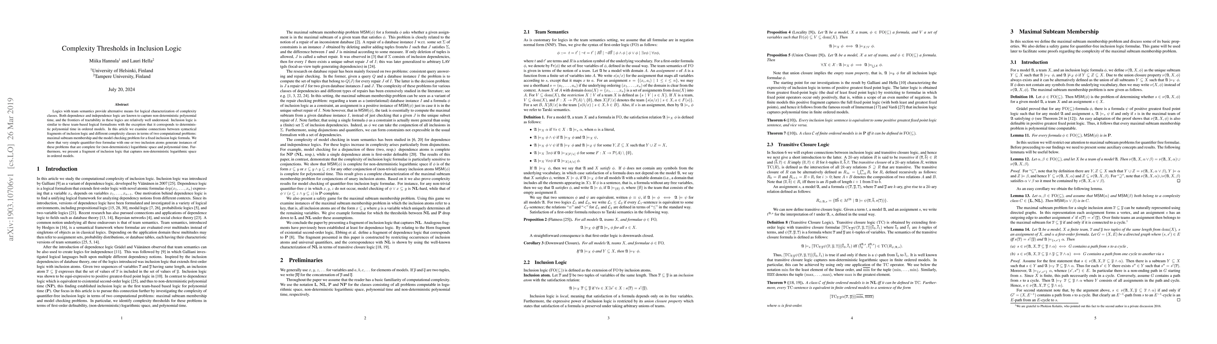 This paper explores the relationship between inclusion logic and complexity classes, demonstrating that simple quantifier-free formulae in inclusion logic can determine complexity thresholds, including non-deterministic logarithmic space and polynomial time. It also identifies a specific fragment of inclusion logic that captures non-deterministic logarithmic space in ordered models.