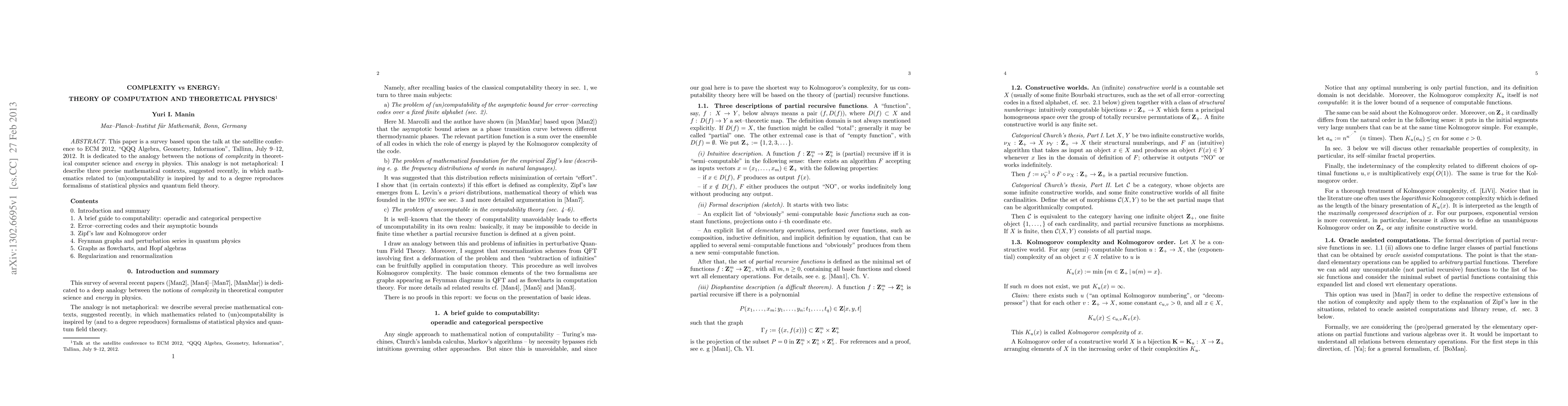 This paper is a survey dedicated to the analogy between the notions of {\it complexity} in theoretical computer science and {\it energy} in physics. This analogy is not metaphorical: I describe three precise mathematical contexts, suggested recently, in which mathematics related to (un)computability is inspired by and to a degree reproduces formalisms of statistical physics and quantum field theory.
