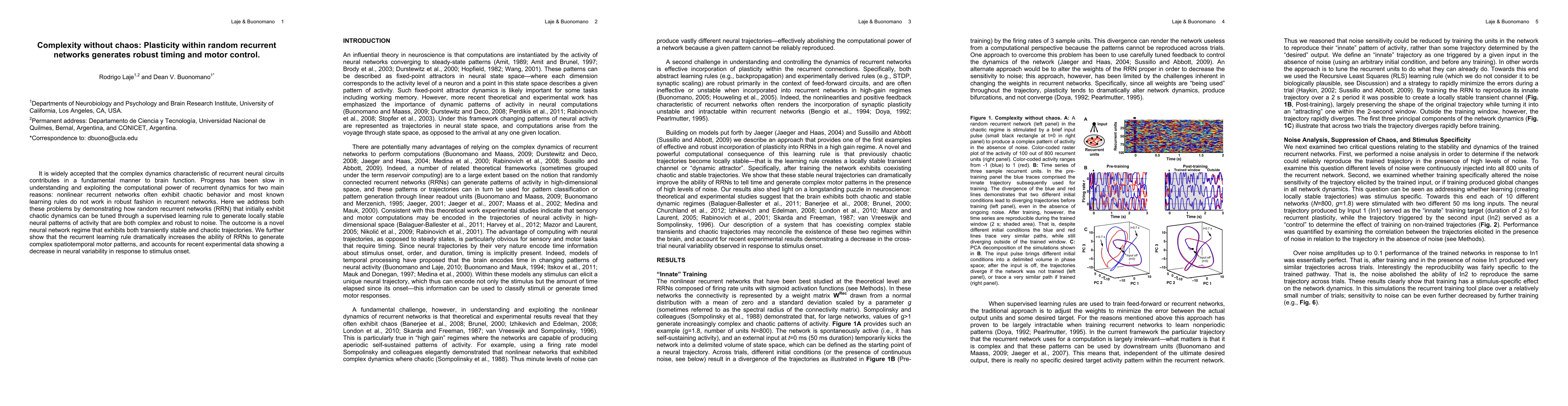 It is widely accepted that the complex dynamics characteristic of recurrent neural circuits contributes in a fundamental manner to brain function. Progress has been slow in understanding and exploiting the computational power of recurrent dynamics for two main reasons: nonlinear recurrent networks often exhibit chaotic behavior and most known learning rules do not work in robust fashion in recurrent networks. Here we address both these problems by demonstrating how random recurrent networks (RRN) that initially exhibit chaotic dynamics can be tuned through a supervised learning rule to generate locally stable neural patterns of activity that are both complex and robust to noise. The outcome is a novel neural network regime that exhibits both transiently stable and chaotic trajectories. We further show that the recurrent learning rule dramatically increases the ability of RRNs to generate complex spatiotemporal motor patterns, and accounts for recent experimental data showing a decrease in neural variability in response to stimulus onset.