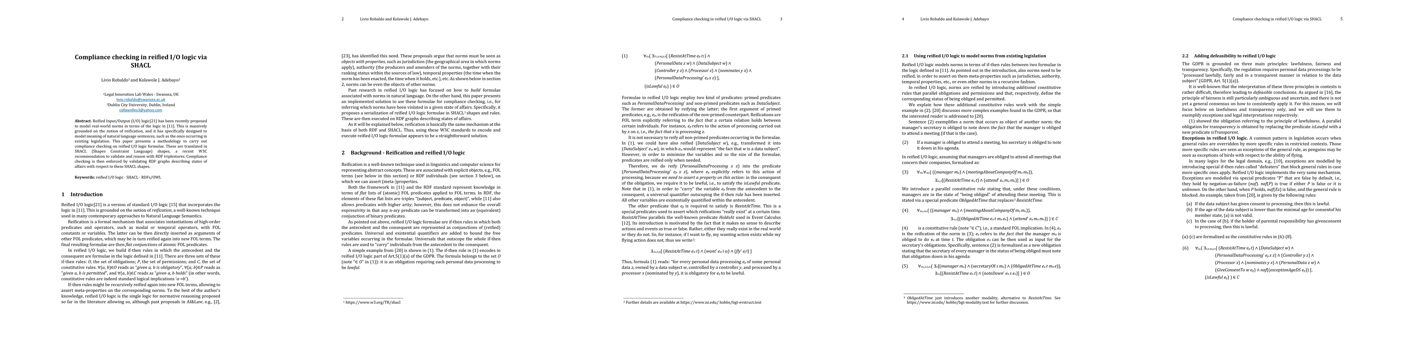 This paper proposes a methodology for compliance checking in reified Input/Output logic by translating it into SHACL shapes, enabling validation of RDF graphs against these shapes to enforce compliance with modeled real-world norms.