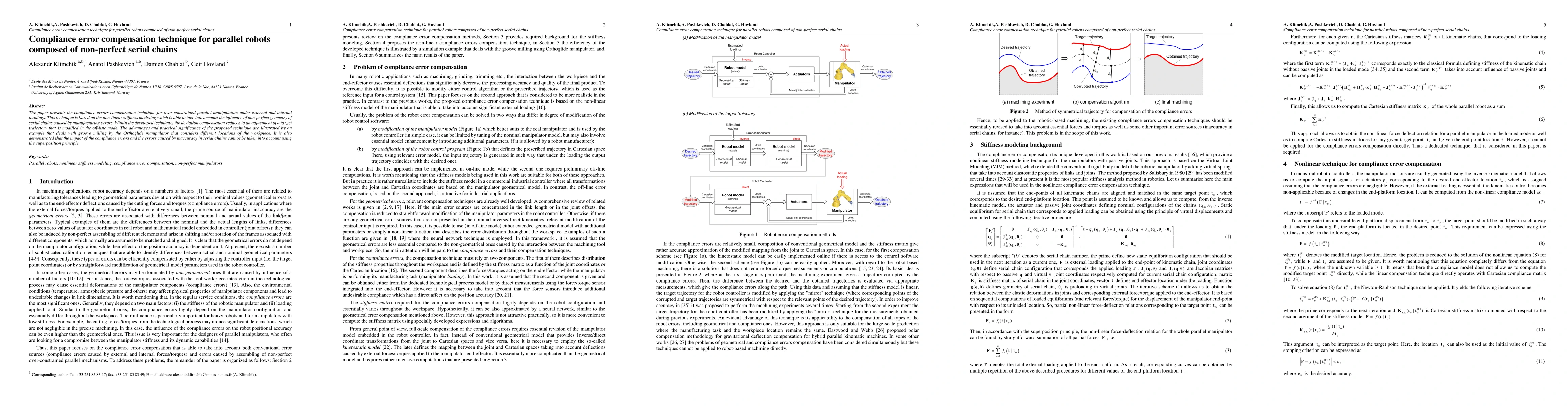 The paper introduces a compliance error compensation technique for over-constrained parallel robots, utilizing non-linear stiffness modeling to address manufacturing errors in serial chains. The technique adjusts the target trajectory off-line to compensate for deviations, illustrated through an example involving groove milling with an Orthoglide manipulator.