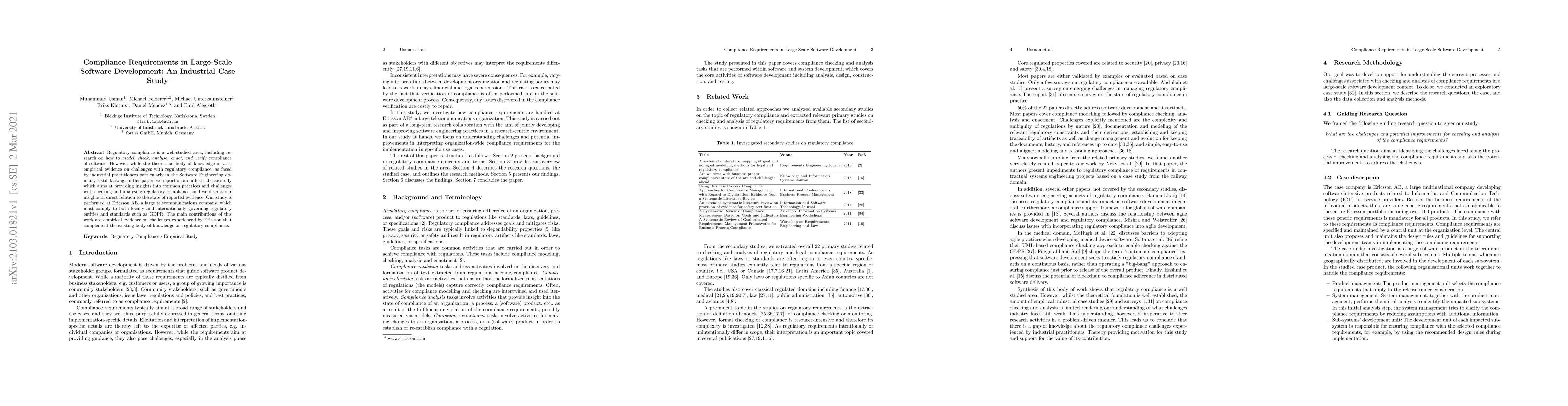 This paper presents an industrial case study from Ericsson AB on regulatory compliance challenges in large-scale software development, highlighting practical issues faced by practitioners and providing empirical evidence to complement existing theoretical knowledge. The study identifies specific challenges related to compliance with standards like GDPR.