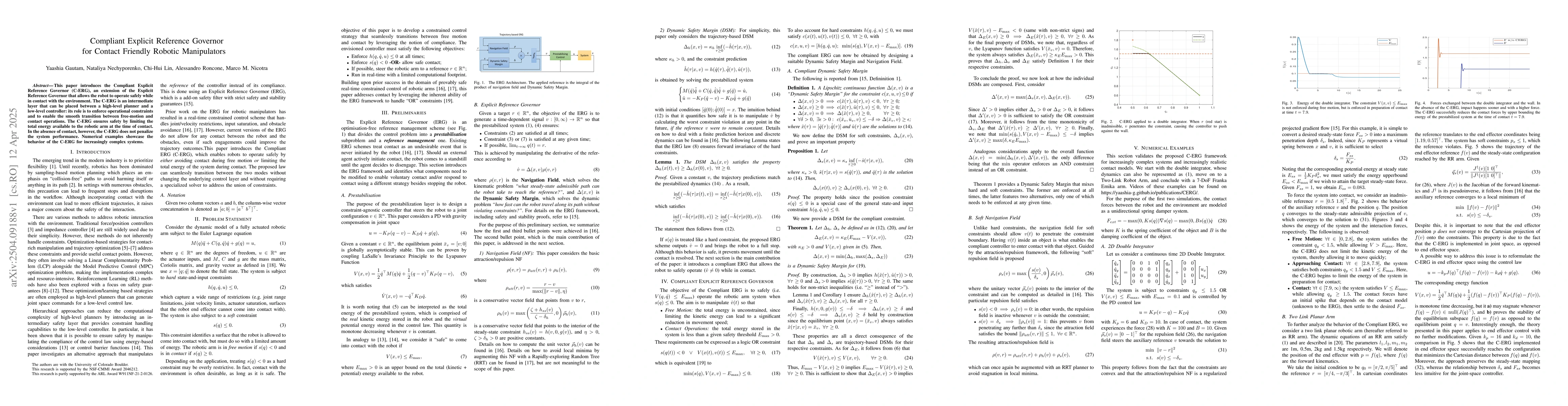 The Compliant Explicit Reference Governor (C-ERG) ensures safe robotic operation while in contact with the environment by limiting energy available to the arm at the time of contact.