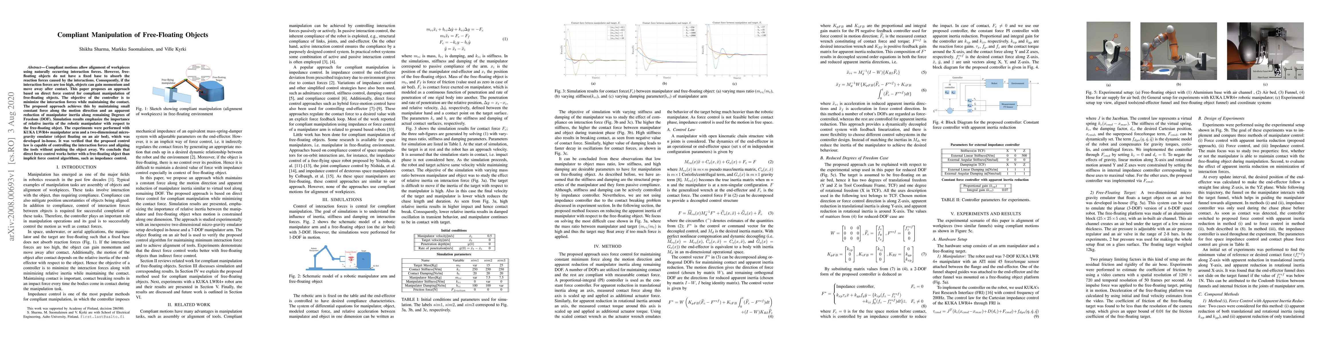 Compliant motions allow alignment of workpieces using naturally occurring interaction forces. However, free-floating objects do not have a fixed base to absorb the reaction forces caused by the interactions. Consequently, if the interaction forces are too high, objects can gain momentum and move away after contact. This paper proposes an approach based on direct force control for compliant manipulation of free-floating objects. The objective of the controller is to minimize the interaction forces while maintaining the contact. The proposed approach achieves this by maintaining small constant force along the motion direction and an apparent reduction of manipulator inertia along remaining Degrees of Freedom (DOF). Simulation results emphasize the importance of relative inertia of the robotic manipulator with respect to the free-floating object. The experiments were performed with KUKA LWR4+ manipulator arm and a two-dimensional micro-gravity emulator (object floating on an air bed), which was developed in-house. It was verified that the proposed control law is capable of controlling the interaction forces and aligning the tools without pushing the object away. We conclude that direct force control works better with a free-floating object than implicit force control algorithms, such as impedance control.
