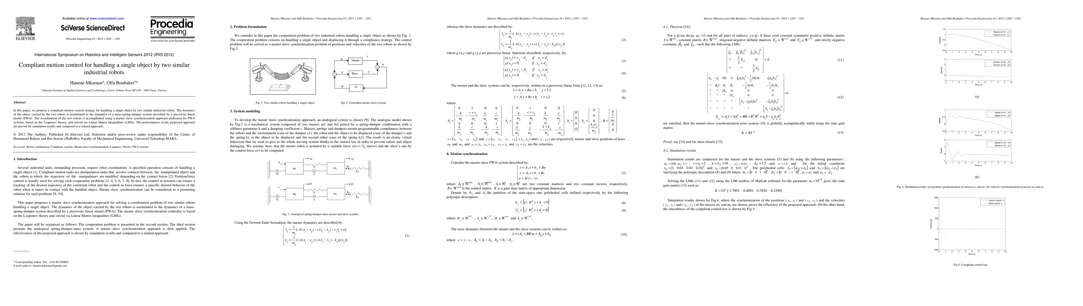 This paper proposes a compliant motion control strategy for two similar industrial robots handling a single object, modeling the dynamics as a piecewise linear mass-spring-damper system. The coordination uses a master-slave synchronization approach based on Lyapunov theory and solved via Linear Matrix Inequalities, validated by simulation results.