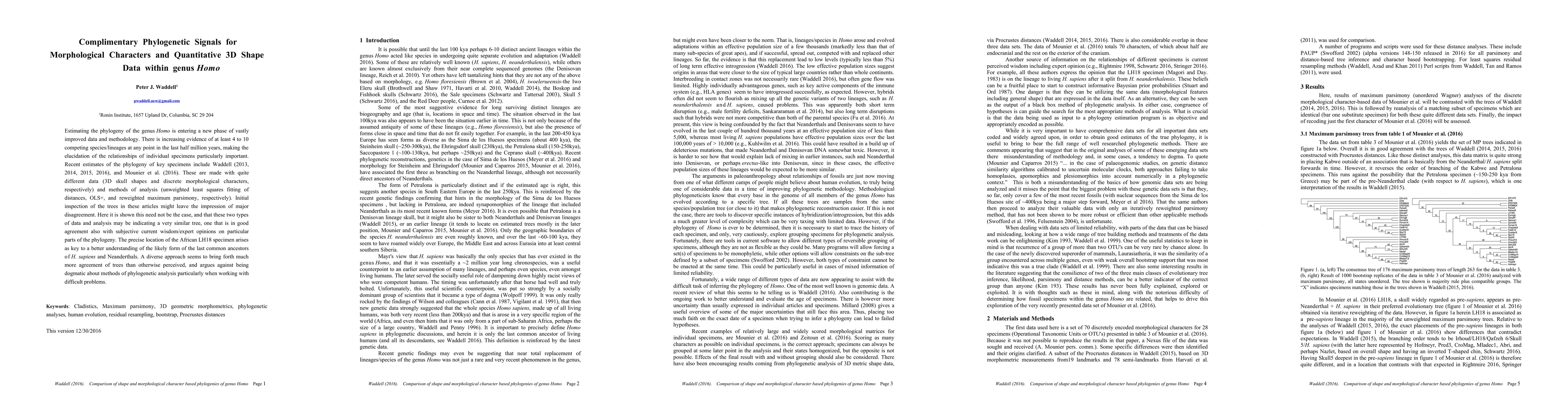 Estimating the phylogeny of the genus Homo is entering a new phase of vastly improved data and methodology. There is increasing evidence of 6 to 10 competing species/lineages at any point in the last half million years, making the elucidation of the relationships of individual specimens particularly important. Recent estimates of the phylogeny of key specimens include Waddell (2013, 2014, 2015, 2016), and Mounier et al. (2016). These are made with quite different data (3D skull shapes and discrete morphological characters, respectively) and methods of analysis (unweighted least squares fitting of distances, OLS+, and reweighted maximum parsimony, respectively). Initial inspection of the trees in these articles might leave the impression of a great deal of disagreement and confused results. Here it is shown this need not be the case, and that these two types of data and analysis may be indicating a very similar tree, one that is in good agreement also with subjective current wisdom/expert opinions on particular parts of the phylogeny. The precise location of the African LH18 specimen arises as key to a better understanding of the likely form of the last common ancestors of H. sapiens and Neanderthals. A diverse approach seems to bring forth much more agreement of trees than otherwise perceived, and argues against being dogmatic about methods of phylogenetic analysis particularly when working with difficult problems.