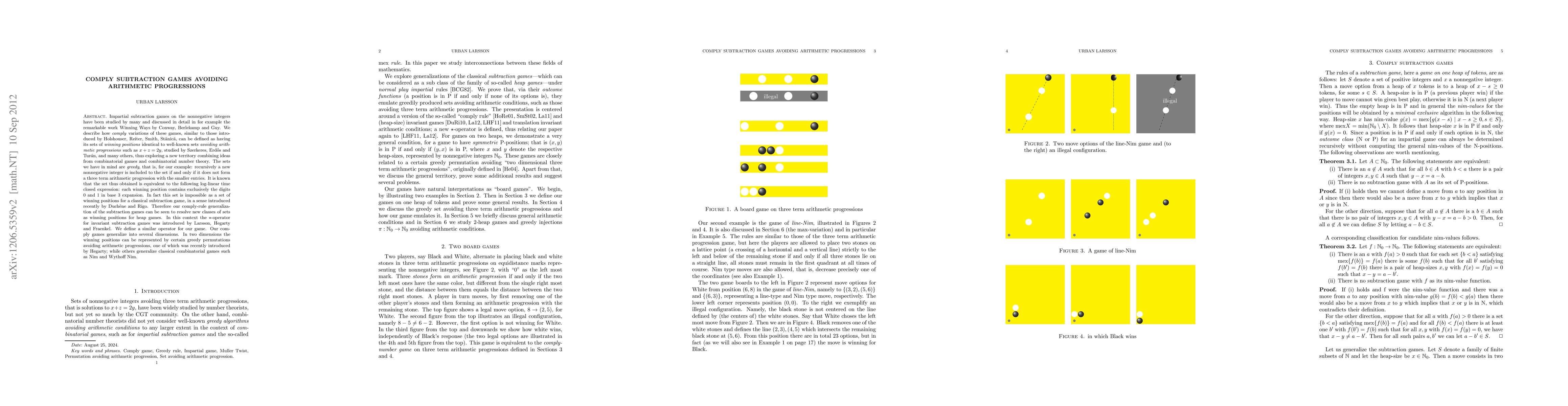 Impartial subtraction games on the nonnegative integers have been studied by many and discussed in detail in for example the remarkable work Winning Ways by Conway, Berlekamp and Guy. We describe how comply variations of these games, similar to those introduced by Holshouser, Reiter, Smith, St\u{a}nic\u{a}, can be defined as having its sets of winning positions identical to well-known sets avoiding arithmetic progressions such as $x+z=2y$, studied by Szerkeres, Erd\H os and Tur\'an, and many others, thus exploring a new territory combining ideas from combinatorial games and combinatorial number theory. The sets we have in mind are greedy, that is, for our example: recursively a new nonnegative integer is included to the set if and only if it does not form a three term arithmetic progression with the smaller entries. It is known that the set thus obtained is equivalent to the following log-linear time closed expression: each winning position contains exclusively the digits 0 and 1 in base 3 expansion. In fact this set is impossible as a set of winning positions for a classical subtraction game, in a sense introduced recently by Duch\^ene and Rigo. Therefore our comply-rule generalization of the subtraction games can be seen to resolve new classes of sets as winning positions for heap games. In this context the $\star$-operator for invariant subtraction games was introduced by Larsson, Hegarty and Fraenkel. We define a similar operator for our game. Our comply games generalize into several dimensions. In two dimensions the winning positions can be represented by certain greedy permutations avoiding arithmetic progressions, one of which was recently introduced by Hegarty; while others generalize classical combinatorial games such as Nim and Wythoff Nim.