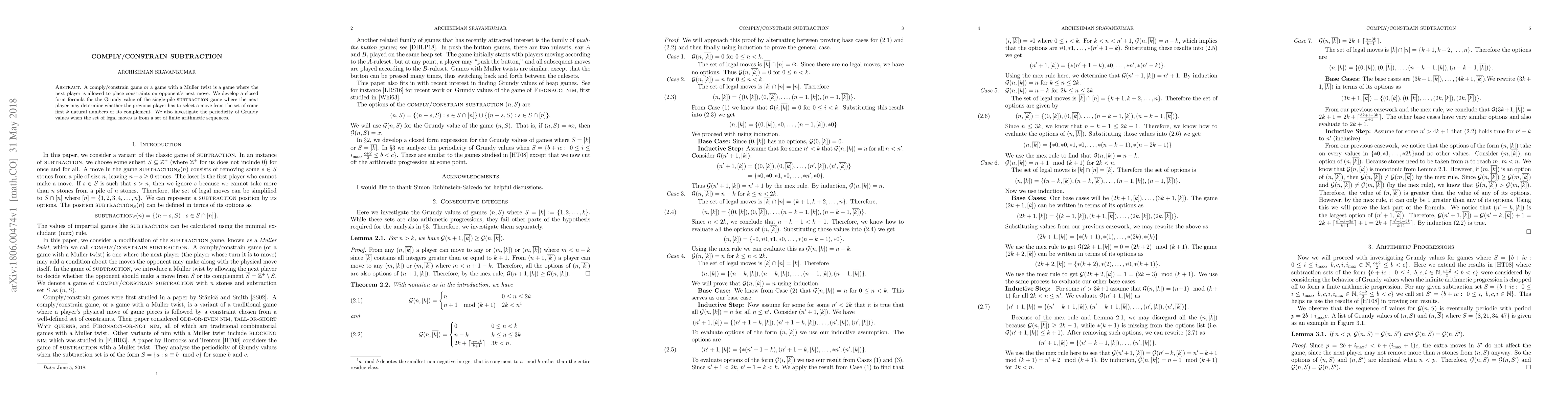 A comply/constrain game or a game with a Muller twist is a game where the next player is allowed to place constraints on opponent's next move. We develop a closed form formula for the Grundy value of the single-pile subtraction game where the next player may determine whether the previous player has to select a move from the set of some first k natural numbers or its complement. We also investigate the periodicity of Grundy values when the set of legal moves is from a set of finite arithmetic sequences.