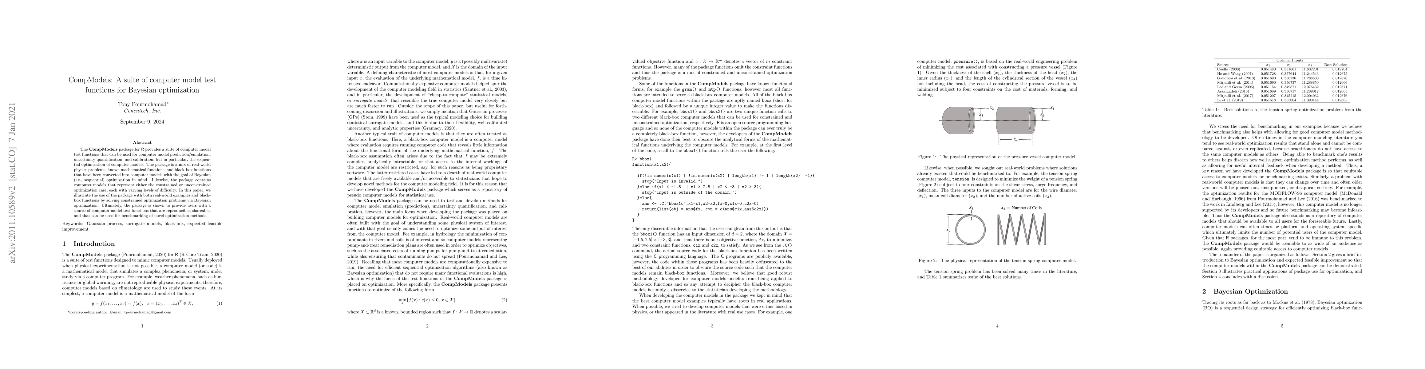 The CompModels R package offers a collection of test functions for Bayesian optimization, encompassing real-world physics problems, mathematical functions, and black-box models. The package aids in benchmarking novel optimization methods through its reproducible and shareable computer models for both constrained and unconstrained optimization scenarios.