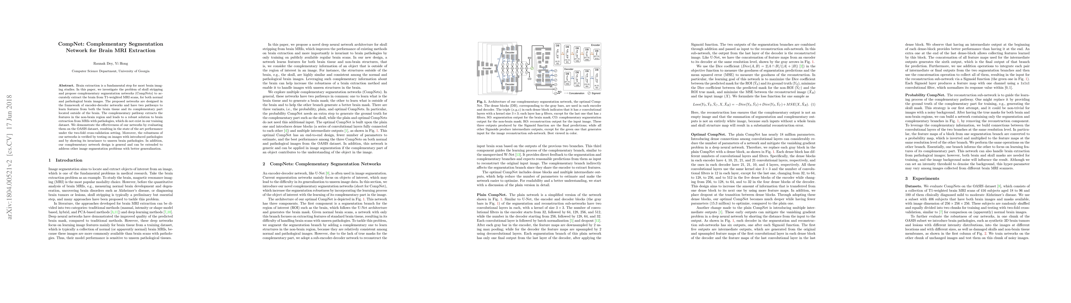 Brain extraction is a fundamental step for most brain imaging studies. In this paper, we investigate the problem of skull stripping and propose complementary segmentation networks (CompNets) to accurately extract the brain from T1-weighted MRI scans, for both normal and pathological brain images. The proposed networks are designed in the framework of encoder-decoder networks and have two pathways to learn features from both the brain tissue and its complementary part located outside of the brain. The complementary pathway extracts the features in the non-brain region and leads to a robust solution to brain extraction from MRIs with pathologies, which do not exist in our training dataset. We demonstrate the effectiveness of our networks by evaluating them on the OASIS dataset, resulting in the state of the art performance under the two-fold cross-validation setting. Moreover, the robustness of our networks is verified by testing on images with introduced pathologies and by showing its invariance to unseen brain pathologies. In addition, our complementary network design is general and can be extended to address other image segmentation problems with better generalization.