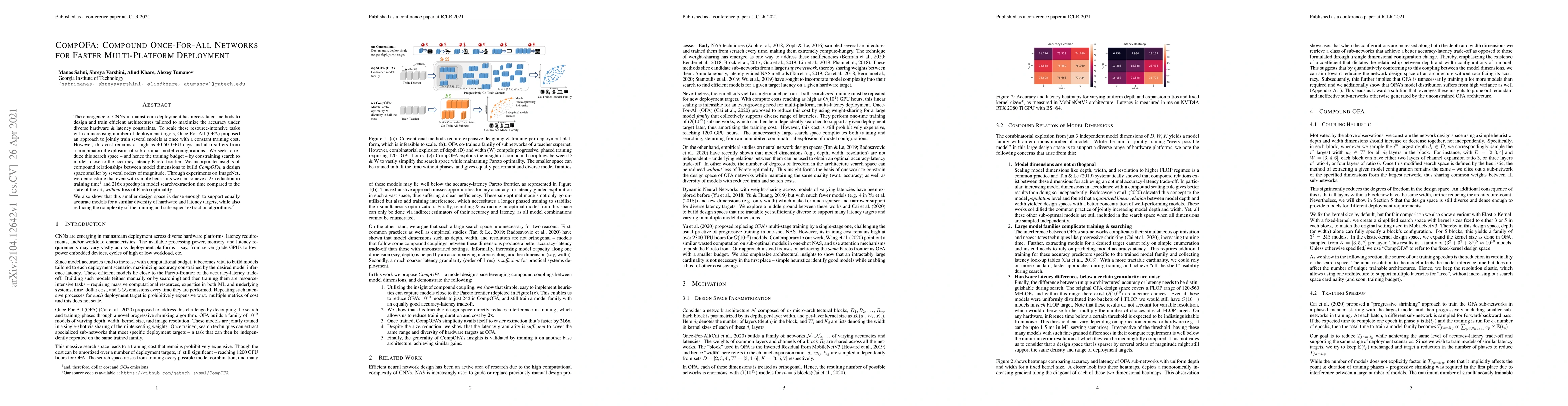 The emergence of CNNs in mainstream deployment has necessitated methods to design and train efficient architectures tailored to maximize the accuracy under diverse hardware & latency constraints. To scale these resource-intensive tasks with an increasing number of deployment targets, Once-For-All (OFA) proposed an approach to jointly train several models at once with a constant training cost. However, this cost remains as high as 40-50 GPU days and also suffers from a combinatorial explosion of sub-optimal model configurations. We seek to reduce this search space -- and hence the training budget -- by constraining search to models close to the accuracy-latency Pareto frontier. We incorporate insights of compound relationships between model dimensions to build CompOFA, a design space smaller by several orders of magnitude. Through experiments on ImageNet, we demonstrate that even with simple heuristics we can achieve a 2x reduction in training time and 216x speedup in model search/extraction time compared to the state of the art, without loss of Pareto optimality! We also show that this smaller design space is dense enough to support equally accurate models for a similar diversity of hardware and latency targets, while also reducing the complexity of the training and subsequent extraction algorithms.
