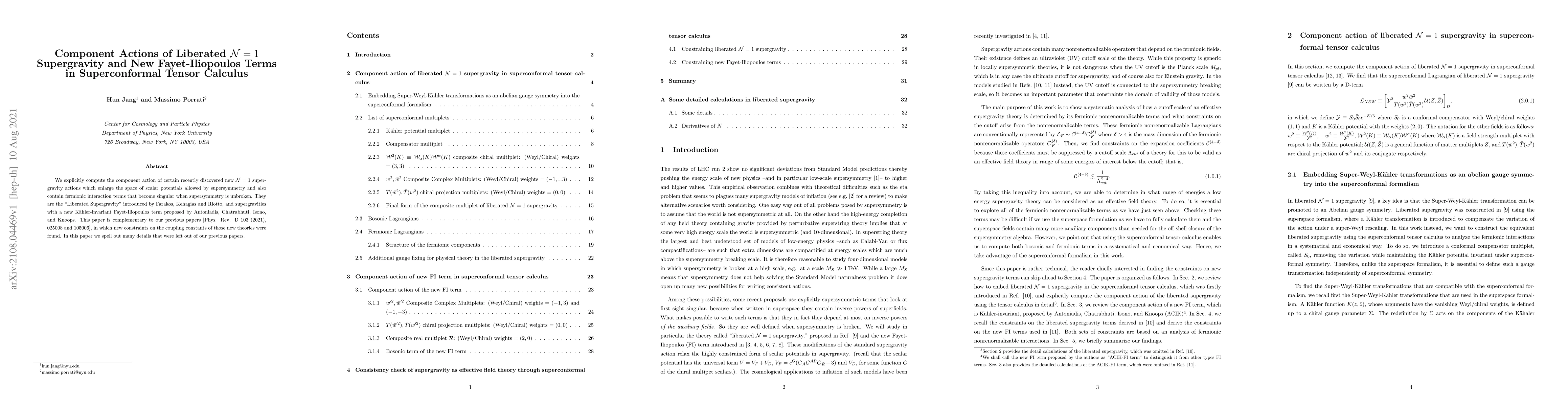 We explicitly compute the component action of certain recently discovered new $\mathcal{N} = 1$ supergravity actions which enlarge the space of scalar potentials allowed by supersymmetry and also contain fermionic interaction terms that become singular when supersymmetry is unbroken. They are the "Liberated Supergravity" introduced by Farakos, Kehagias and Riotto, and supergravities with a new Kahler-invariant Fayet-Iliopoulos term proposed by Antoniadis, Chatrabhuti, Isono, and Knoops. This paper is complementary to our previous papers [Phys. Rev. D 103 (2021), 025008 and 105006], in which new constraints on the coupling constants of those new theories were found. In this paper we spell out many details that were left out of our previous papers.