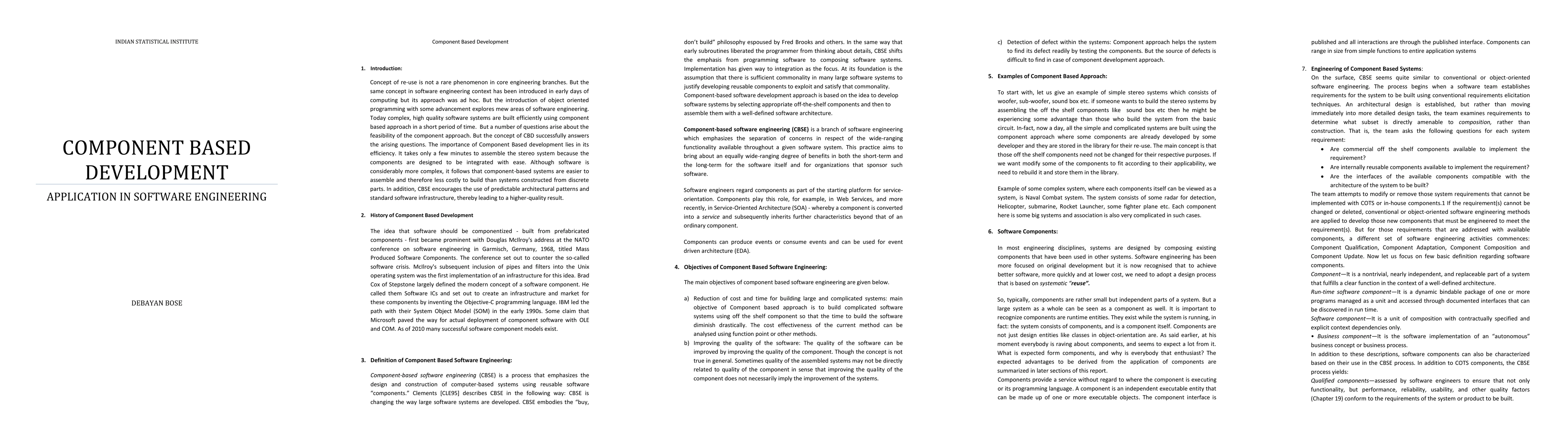 This study explores the benefits of component-based software development, highlighting its life-cycle, cost effectiveness, and application perspective, while contrasting it with object-oriented approach in the field of engineering.
