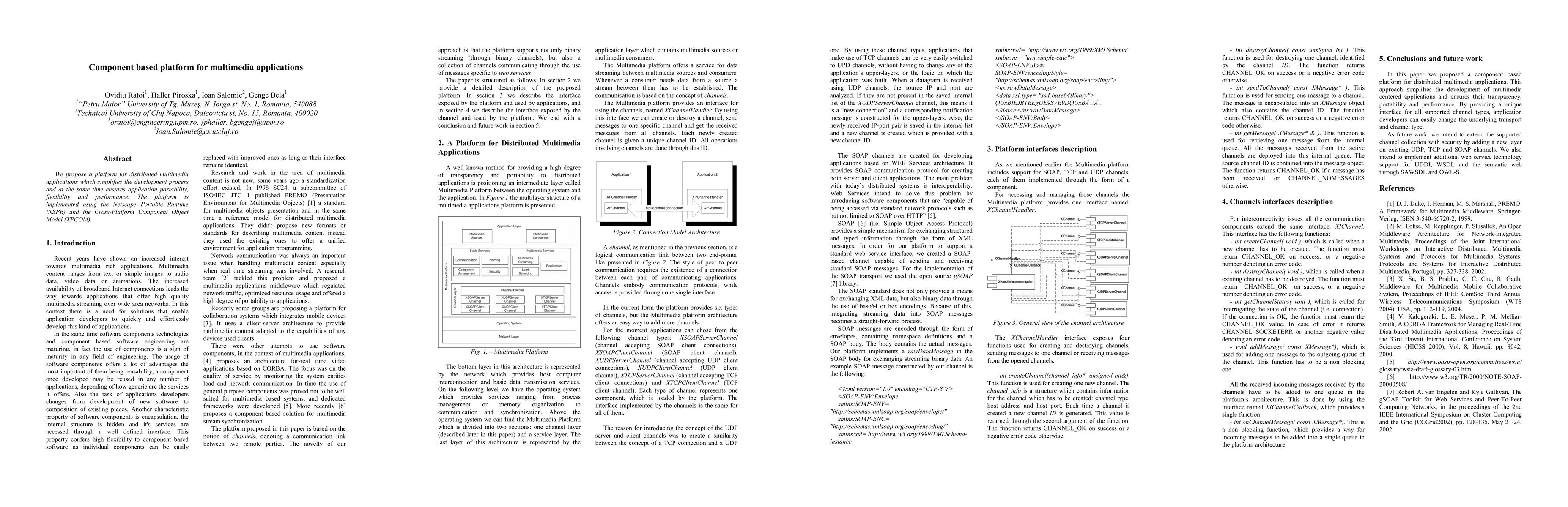 Summary: This paper introduces a platform for distributed multimedia applications that leverages the Netscape Portable Runtime (NSPR) and XPCOM to simplify development, enhance portability, flexibility, and performance. The platform aims to streamline the creation of multimedia applications across different platforms.