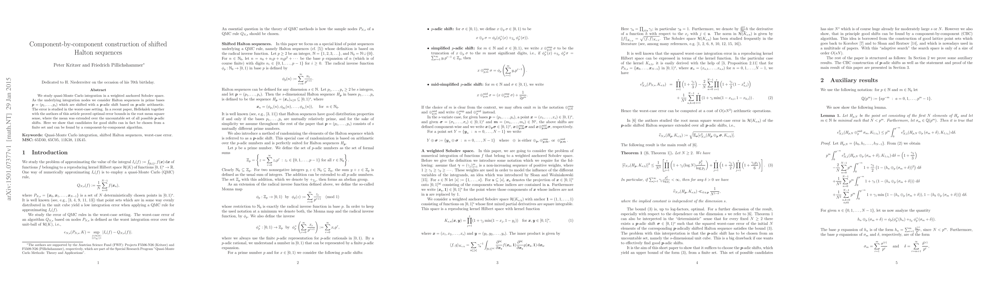 We study quasi-Monte Carlo integration in a weighted anchored Sobolev space. As the underlying integration nodes we consider Halton sequences in prime bases $\boldsymbol{p}=(p_1,\ldots,p_s)$ which are shifted with a $\boldsymbol{p}$-adic shift based on $\boldsymbol{p}$-adic arithmetic. The error is studied in the worst-case setting. In a recent paper, Hellekalek together with the authors of this article proved optimal error bounds in the root mean square sense, where the mean was extended over the uncountable set of all possible $\boldsymbol{p}$-adic shifts. Here we show that candidates for good shifts can in fact be chosen from a finite set and can be found by a component-by-component algorithm.