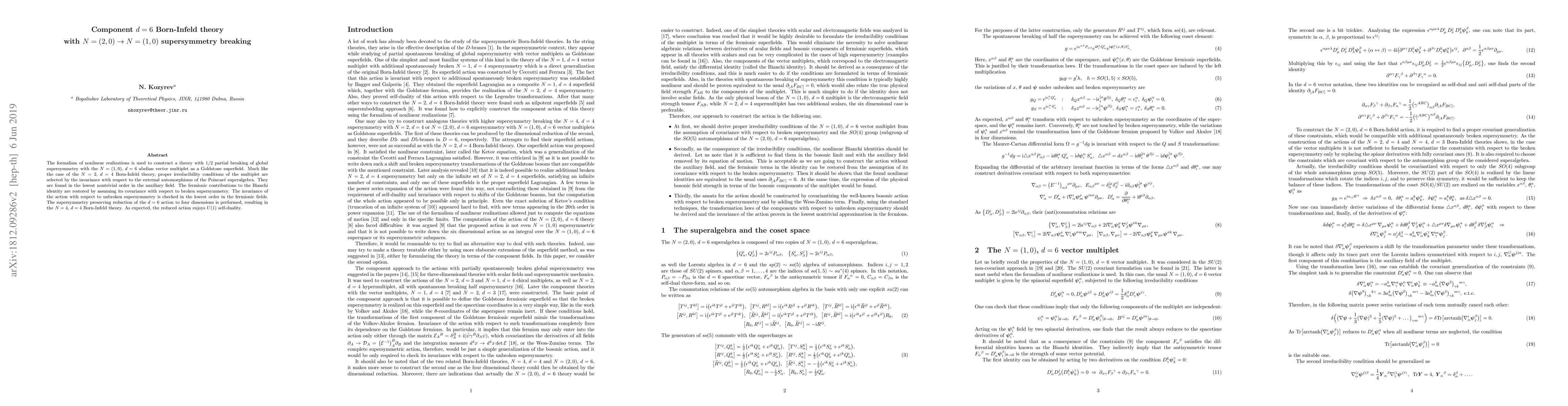 This paper constructs a $d=6$ Born-Infeld theory with $N=(1,0)$ supersymmetry through nonlinear realizations, achieving $1/2$ partial breaking of global supersymmetry. The reduced $d=4$ action yields the $N=4$ $d=4$ Born-Infeld theory, which exhibits $U(1)$ self-duality.
