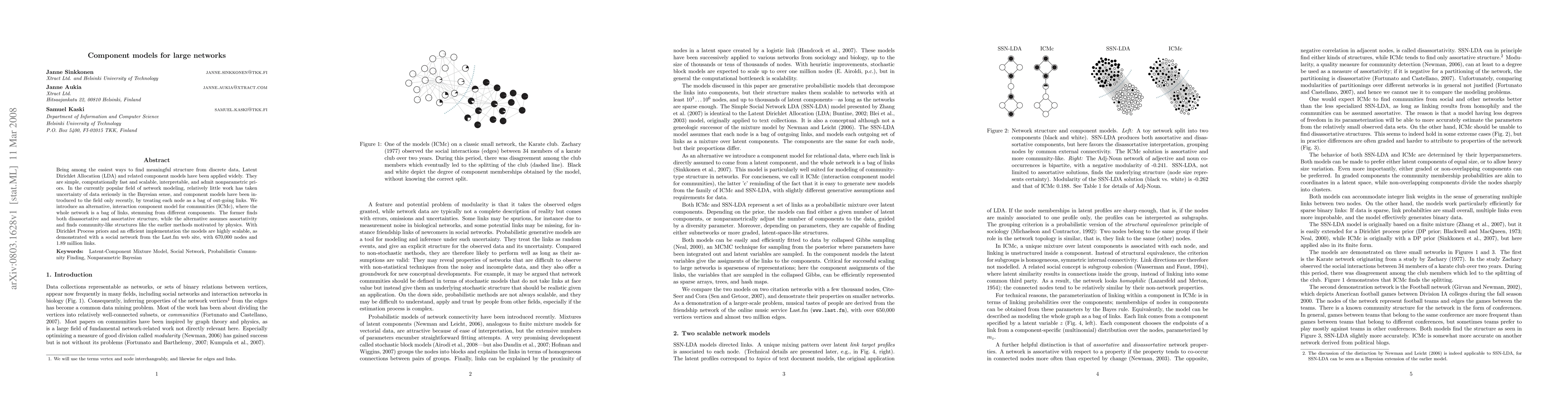Being among the easiest ways to find meaningful structure from discrete data, Latent Dirichlet Allocation (LDA) and related component models have been applied widely. They are simple, computationally fast and scalable, interpretable, and admit nonparametric priors. In the currently popular field of network modeling, relatively little work has taken uncertainty of data seriously in the Bayesian sense, and component models have been introduced to the field only recently, by treating each node as a bag of out-going links. We introduce an alternative, interaction component model for communities (ICMc), where the whole network is a bag of links, stemming from different components. The former finds both disassortative and assortative structure, while the alternative assumes assortativity and finds community-like structures like the earlier methods motivated by physics. With Dirichlet Process priors and an efficient implementation the models are highly scalable, as demonstrated with a social network from the Last.fm web site, with 670,000 nodes and 1.89 million links.