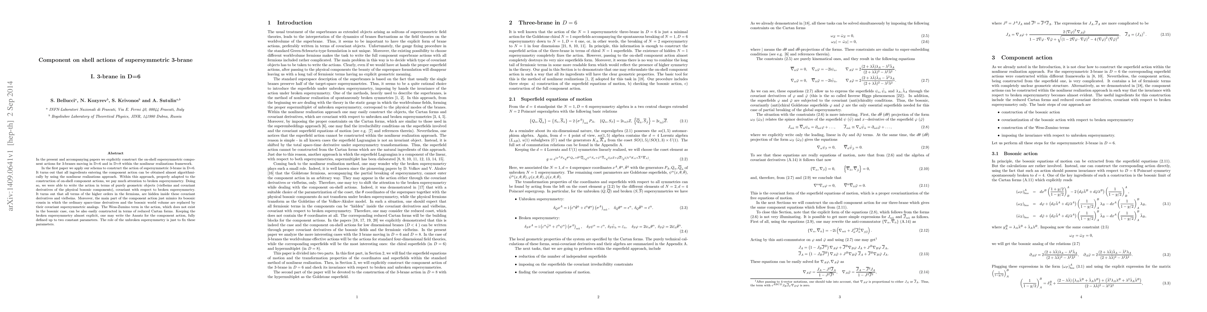 This paper constructs the on-shell supersymmetric component action for a 3-brane in D=6 using the nonlinear realizations framework, showing that all terms can be algorithmically derived. The action is expressed in terms of covariant geometric objects, with higher-order fermion terms embedded within these, and the Wess-Zumino term constructed from reduced Cartan forms.