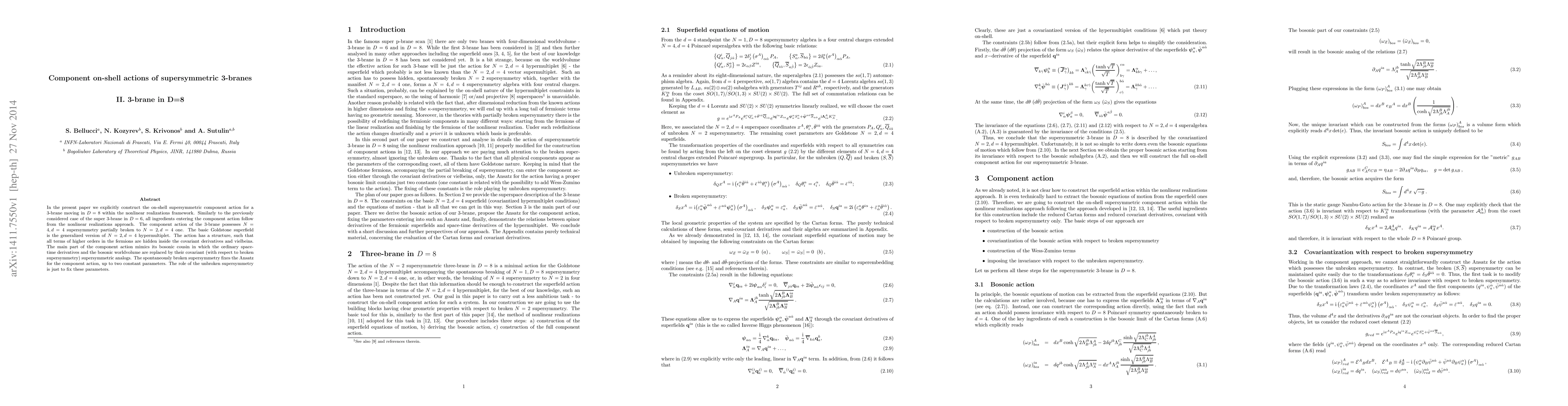 This paper constructs the on-shell supersymmetric component action for a 3-brane in D=8 within the nonlinear realizations framework, revealing N=4 to N=2 supersymmetry breaking. The action's structure incorporates higher-order fermion terms via covariant derivatives and vielbeins, closely mimicking the bosonic counterpart.