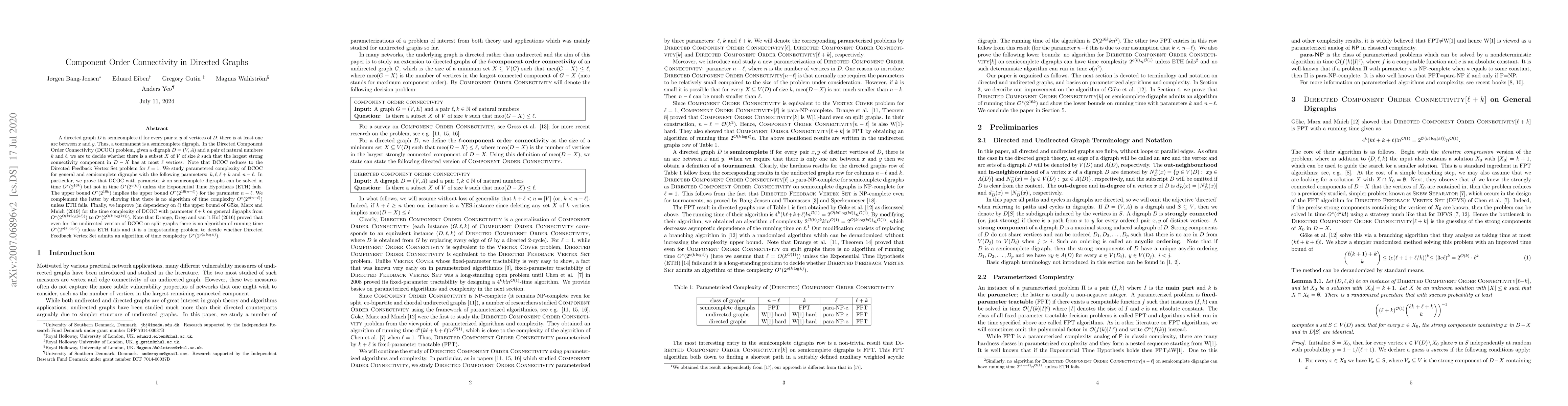 A directed graph $D$ is semicomplete if for every pair $x,y$ of vertices of $D,$ there is at least one arc between $x$ and $y.$ \viol{Thus, a tournament is a semicomplete digraph.} In the Directed Component Order Connectivity (DCOC) problem, given a digraph $D=(V,A)$ and a pair of natural numbers $k$ and $\ell$, we are to decide whether there is a subset $X$ of $V$ of size $k$ such that the largest strong connectivity component in $D-X$ has at most $\ell$ vertices. Note that DCOC reduces to the Directed Feedback Vertex Set problem for $\ell=1.$ We study parametered complexity of DCOC for general and semicomplete digraphs with the following parameters: $k, \ell,\ell+k$ and $n-\ell$. In particular, we prove that DCOC with parameter $k$ on semicomplete digraphs can be solved in time $O^*(2^{16k})$ but not in time $O^*(2^{o(k)})$ unless the Exponential Time Hypothesis (ETH) fails. \gutin{The upper bound $O^*(2^{16k})$ implies the upper bound $O^*(2^{16(n-\ell)})$ for the parameter $n-\ell.$ We complement the latter by showing that there is no algorithm of time complexity $O^*(2^{o({n-\ell})})$ unless ETH fails.} Finally, we improve \viol{(in dependency on $\ell$)} the upper bound of G{\"{o}}ke, Marx and Mnich (2019) for the time complexity of DCOC with parameter $\ell+k$ on general digraphs from $O^*(2^{O(k\ell\log (k\ell))})$ to $O^*(2^{O(k\log (k\ell))}).$ Note that Drange, Dregi and van 't Hof (2016) proved that even for the undirected version of DCOC on split graphs there is no algorithm of running time $O^*(2^{o(k\log \ell)})$ unless ETH fails and it is a long-standing problem to decide whether Directed Feedback Vertex Set admits an algorithm of time complexity $O^*(2^{o(k\log k)}).$