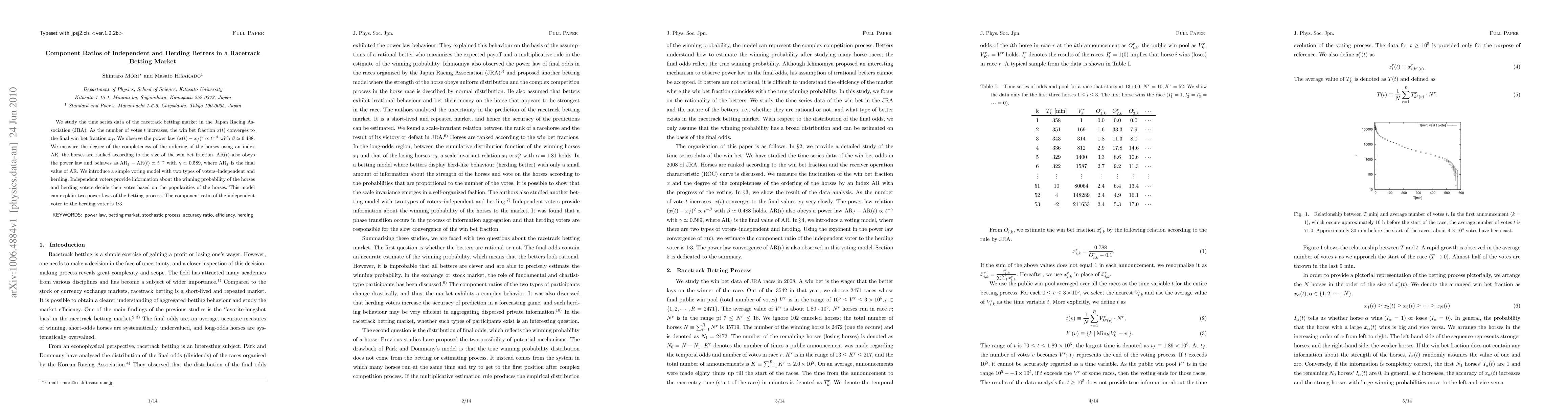 We study the time series data of the racetrack betting market in the Japan Racing Association (JRA). As the number of votes t increases, the win bet fraction x(t) converges to the final win bet fraction x_{f}. We observe the power law $(x(t)-x_{f})^{2} \propto t^{-\beta}$ with $\beta\simeq 0.488$. We measure the degree of the completeness of the ordering of the horses using an index AR, the horses are ranked according to the size of the win bet fraction. AR(t) also obeys the power law and behaves as $\mbox{AR}_{f}-\mbox{AR}(t)\propto t^{-\gamma}$ with $\gamma\simeq 0.589$, where AR_{f} is the final value of AR. We introduce a simple voting model with two types of voters-independent and herding. Independent voters provide information about the winning probability of the horses and herding voters decide their votes based on the popularities of the horses.This model can explain two power laws of the betting process. The component ratio of the independent voter to the herding voter is 1:3.