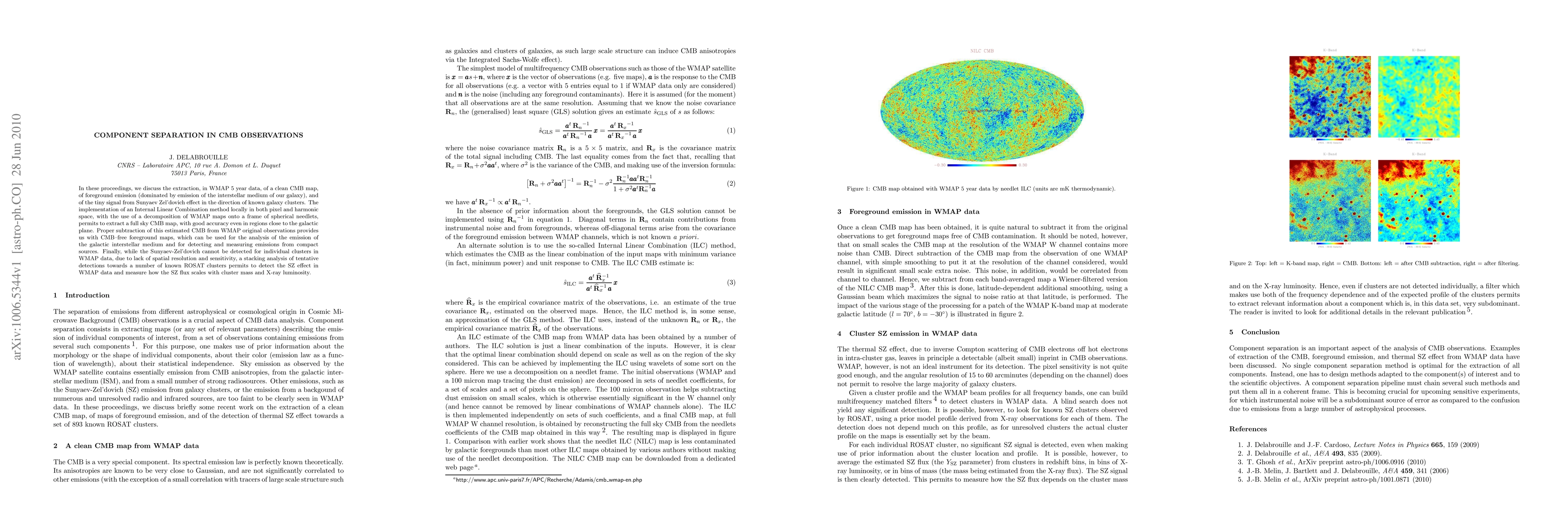 In these proceedings, we discuss the extraction, in WMAP 5 year data, of a clean CMB map, of foreground emission (dominated by emission of the interstellar medium of our galaxy), and of the tiny signal from Sunyaev Zel'dovich effect in the direction of known galaxy clusters. The implementation of an Internal Linear Combination method locally in both pixel and harmonic space, with the use of a decomposition of WMAP maps onto a frame of spherical needlets, permits to extract a full sky CMB map, with good accuracy even in regions close to the galactic plane. Proper subtraction of this estimated CMB from WMAP original observations provides us with CMB-free foreground maps, which can be used for the analysis of the emission of the galactic interstellar medium and for detecting and measuring emissions from compact sources. Finally, while the Sunyaev-Zel'dovich cannot be detected for individual clusters in WMAP data, due to lack of spatial resolution and sensitivity, a stacking analysis of tentative detections towards a number of known ROSAT clusters permits to detect the SZ effect in WMAP data and measure how the SZ flux scales with cluster mass and X-ray luminosity.