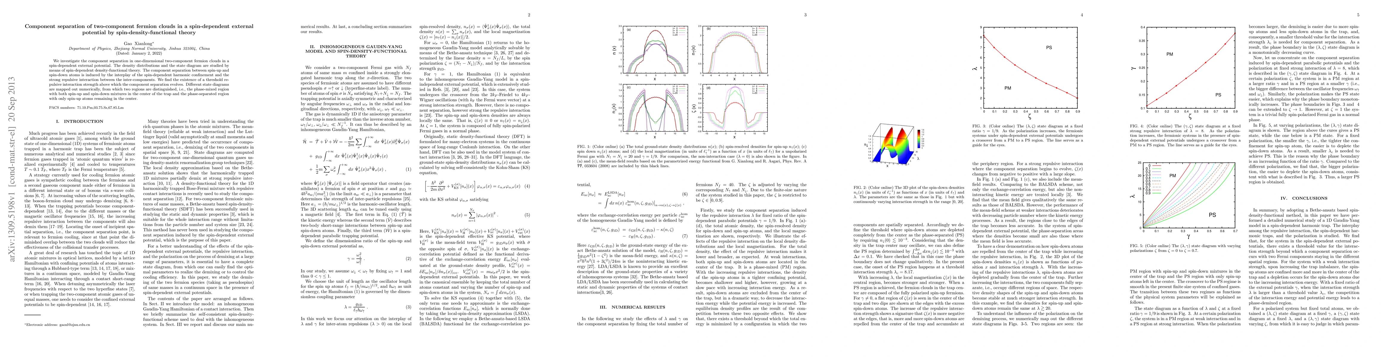 This paper explores the component separation of one-dimensional two-component fermion clouds under a spin-dependent external potential using spin-density-functional theory. It reveals a threshold interaction strength that induces separation between spin-up and spin-down atoms, leading to distinct phase-mixed and phase-separated regions.