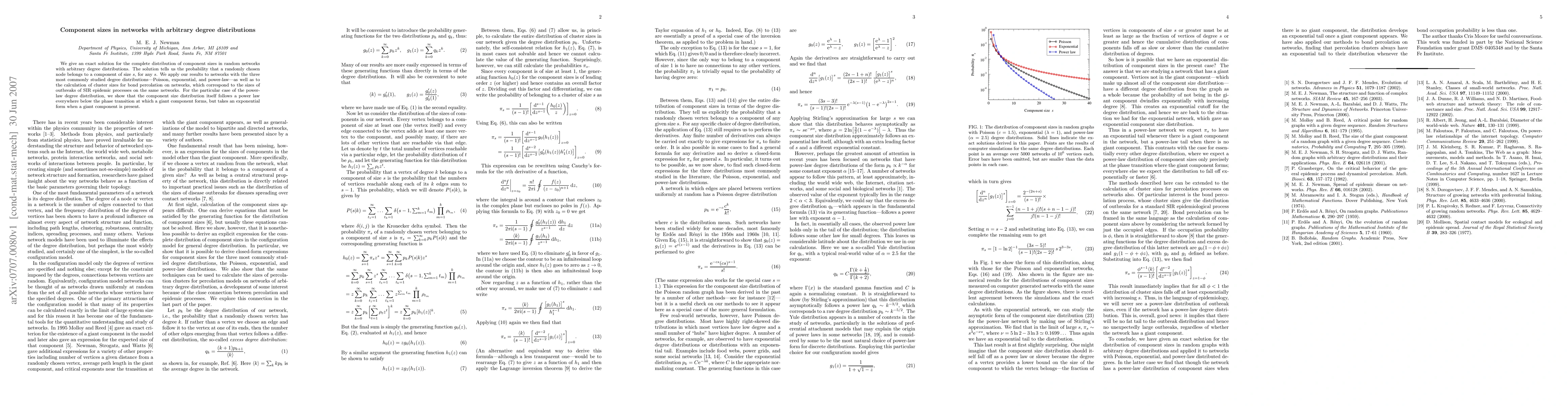 This paper provides an exact solution for the distribution of component sizes in random networks with arbitrary degree distributions, revealing the probability of a node belonging to a component of size s. It applies these findings to common degree distributions and demonstrates that component size distributions follow a power law below a phase transition, changing to an exponential form when a giant component emerges.
