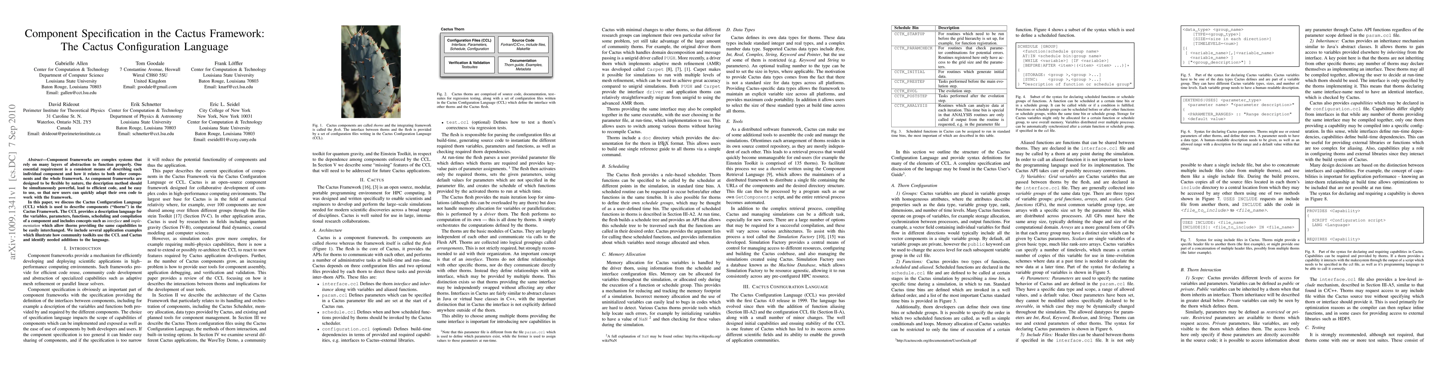 This paper introduces the Cactus Configuration Language (CCL) used to describe components in the Cactus Framework, emphasizing its role in enabling efficient, flexible, and user-friendly component integration. The CCL facilitates the description of variables, parameters, functions, and scheduling, and includes concepts for interchangeable component interfaces and implementations.