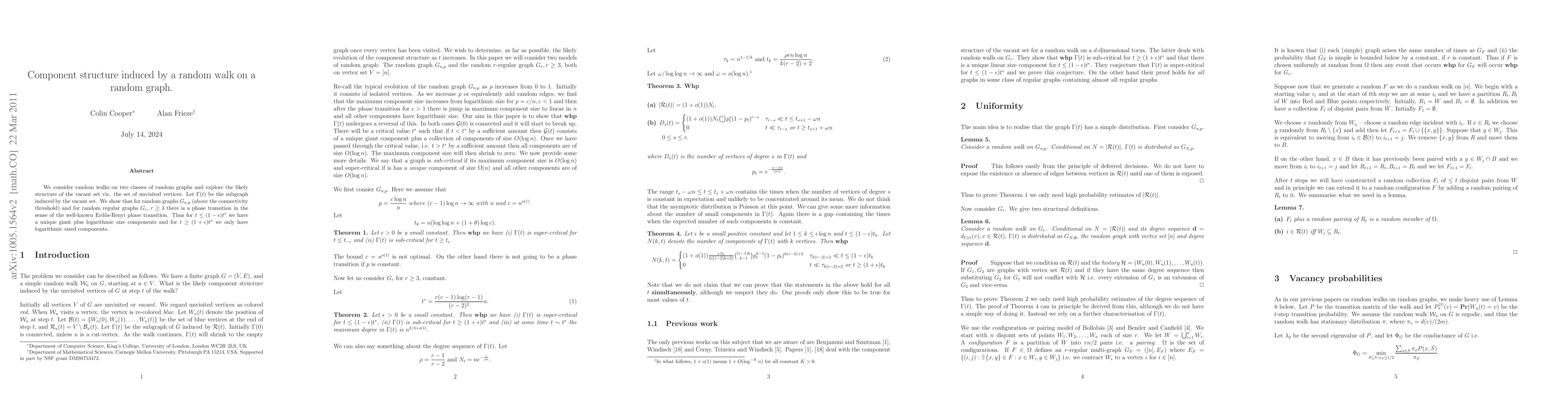 We consider random walks on several classes of graphs and explore the likely structure of the vacant set, i.e. the set of unvisited vertices. Let \Gamma(t) be the subgraph induced by the vacant set of the walk at step t. We show that for random graphs G_{n,p} (above the connectivity threshold) and for random regular graphs G_r, r \geq 3, the graph \Gamma(t) undergoes a phase transition in the sense of the well-known Erdos-Renyi phase transition. Thus for t \leq (1-\epsilon)t^*, there is a unique giant component, plus components of size O(log n), and for t \geq (1+\epsilon)t^* all components are of size O(log n). For G_{n,p} and G_r we give the value of t^*, and the size of \Gamma(t). For G_r, we also give the degree sequence of \Gamma(t), the size of the giant component (if any) of \Gamma(t) and the number of tree components of \Gamma(t) of a given size k=O(log n). We also show that for random digraphs D_{n,p} above the strong connectivity threshold, there is a similar directed phase transition. Thus for t\leq (1-\epsilon)t^*, there is a unique strongly connected giant component, plus strongly connected components of size O(log n), and for t\geq (1+\epsilon)t^* all strongly connected components are of size O(log n).