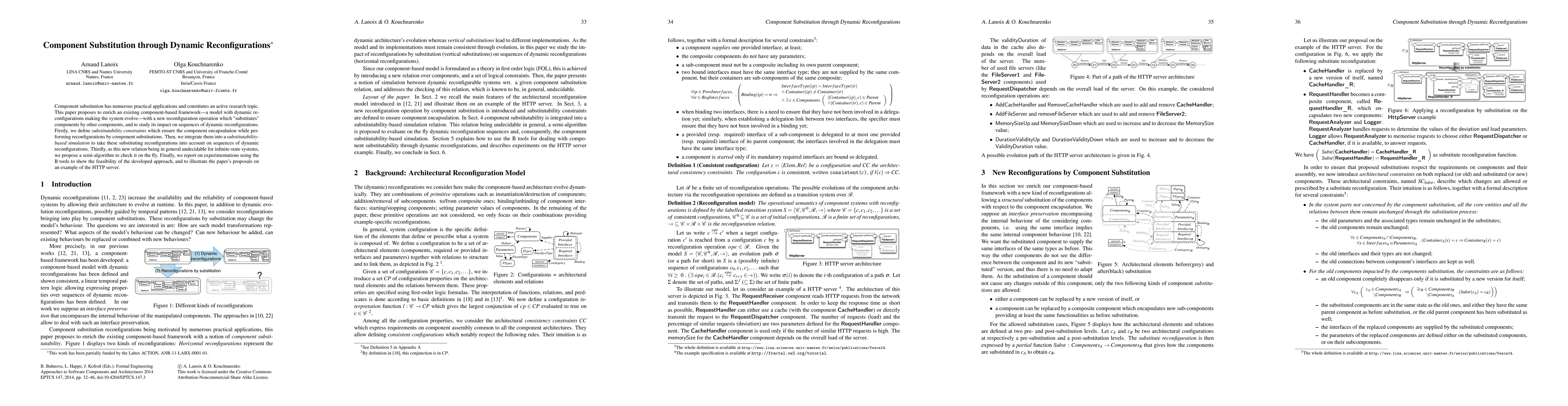 This paper introduces a new reconfiguration operation for component substitution within a dynamic framework, defining substitutability constraints and integrating them into a simulation. It also proposes a semi-algorithm for checking these constraints and demonstrates feasibility using the B tools on an HTTP server example.