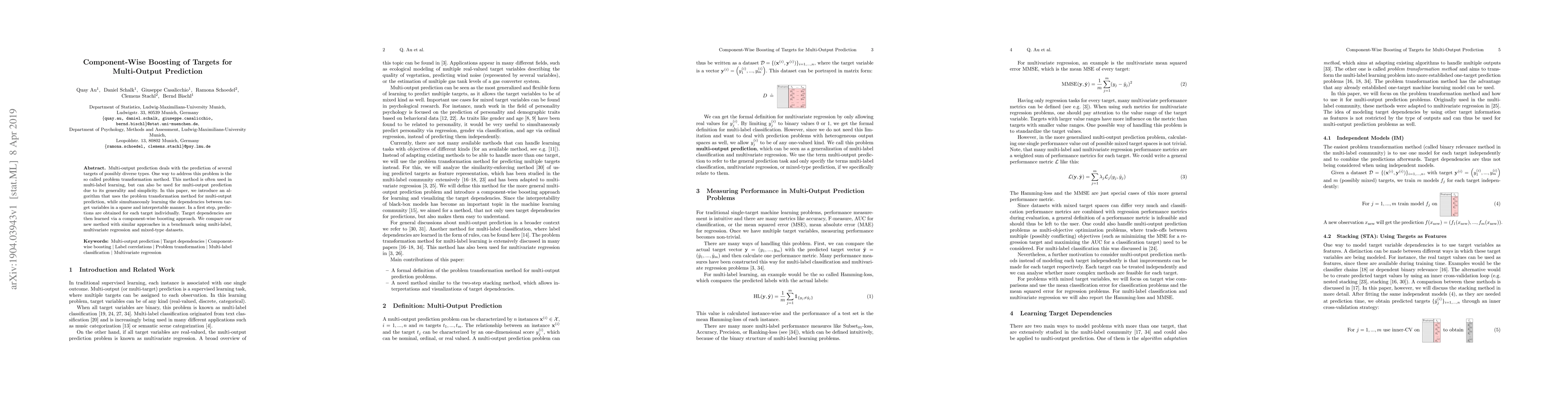 This paper introduces a new algorithm for multi-output prediction using the problem transformation method, which learns target variable dependencies in a sparse and interpretable manner. It employs a component-wise boosting approach, outperforming similar methods in benchmark tests with multi-label, multivariate regression, and mixed-type datasets.