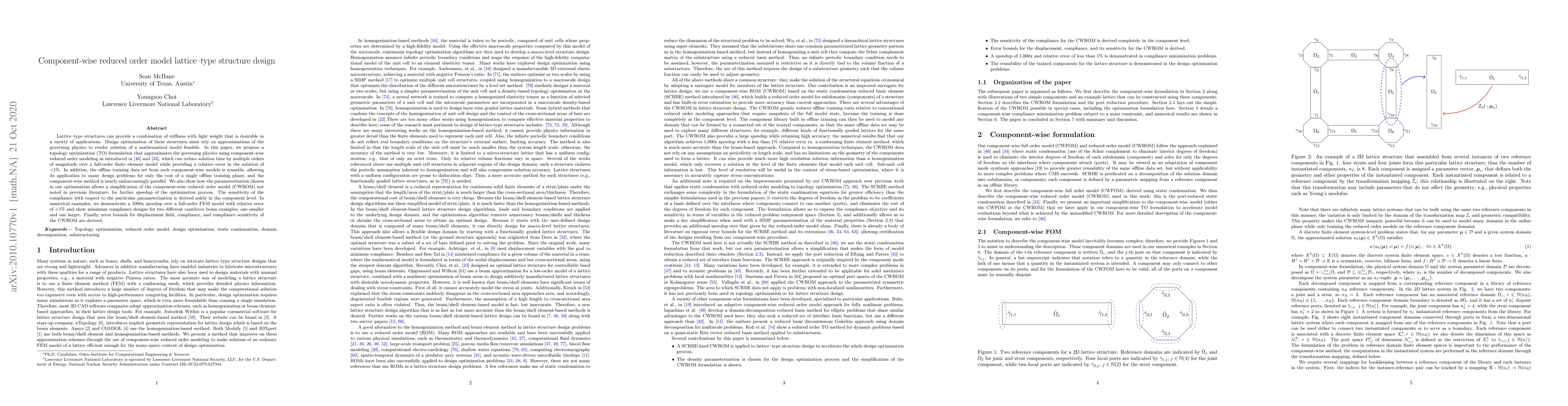Lattice-type structures can provide a combination of stiffness with light weight that is desirable in a variety of applications. Design optimization of these structures must rely on approximations of the governing physics to render solution of a mathematical model feasible. In this paper, we propose a topology optimization (TO) formulation that approximates the governing physics using component-wise reduced order modeling, which can reduce solution time by multiple orders of magnitude over a full-order finite element model while providing a relative error in the solution of less than one percent. In addition, the offline training data set from such component-wise models is reusable, allowing its application to many design problems for only the cost of a single offline training phase, and the component-wise method is nearly embarrassingly parallel. We also show how the parameterization chosen in our optimization allows a simplification of the component-wise reduced order model (CWROM) not noted in previous literature, for further speedup of the optimization process. The sensitivity of the compliance with respect to the particular parameterization is derived solely in the component level. In numerical examples, we demonstrate a 1000x speedup over a full-order FEM model with relative error of less than one percent and show minimum compliance designs for two different cantilever beam examples, one smaller and one larger. Finally, error bounds for displacement field, compliance, and compliance sensitivity of the CWROM are derived.