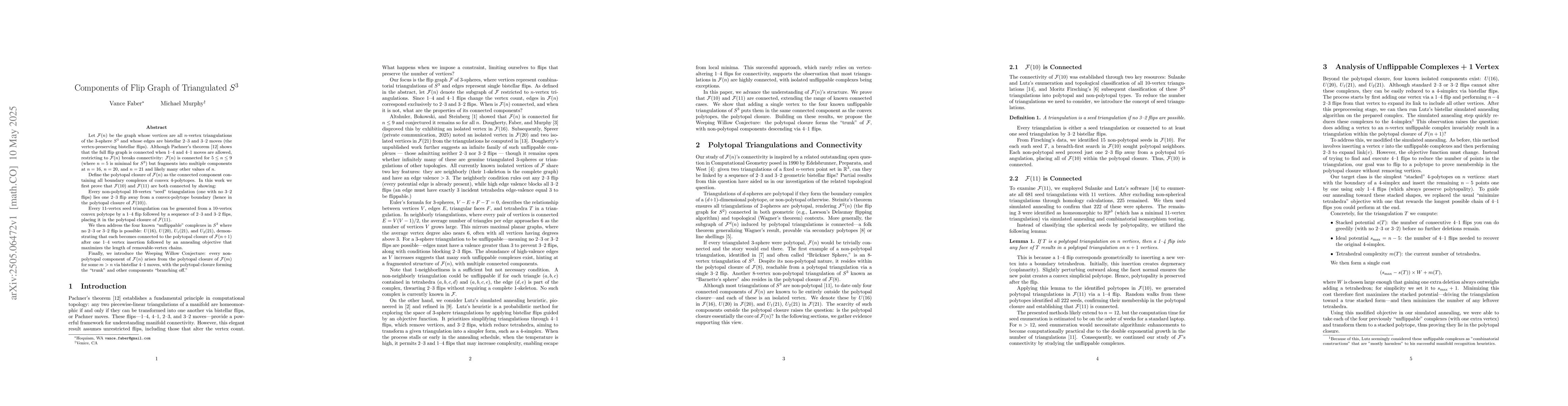 Let (\mathcal{F}(n)) be the graph of (n)-vertex triangulations of the 3-sphere (S^3), with edges as bistellar 2--3 and 3--2 moves. Pachner's theorem \cite{P91} shows the flip graph is connected with 1--4 and 4--1 moves, but (\mathcal{F}(n)) loses connectivity: it is connected for (5 \leq n \leq 9) ((n=5) minimal for (S^3)) but splits into multiple components at (n=16), (n=20), (n=21), and likely beyond. The polytopal closure of (\mathcal{F}(n)) is the component with all boundary complexes of convex 4-polytopes. We prove (\mathcal{F}(10)) and (\mathcal{F}(11)) are connected by showing: every non-polytopal 10-vertex seed triangulation (no 3--2 flips) is one 2--3 flip from a convex-polytope boundary, and every 11-vertex seed triangulation arises from a 10-vertex convex polytope via a 1--4 flip and 2--3 or 3--2 flips, both in the polytopal closure. We address four unflippable (S^3) complexes ((U(16)), (U(20)), (U_1(21)), (U_2(21))), showing each connects to the polytopal closure of (\mathcal{F}(n+1)) after one 1--4 vertex insertion and an annealing process maximizing removable-vertex chains. We propose the Weeping Willow Conjecture: non-polytopal components of (\mathcal{F}(n)) stem from the polytopal closure of (\mathcal{F}(m)), (m > n), via 4--1 moves, with the polytopal closure as the trunk and other components as branches.