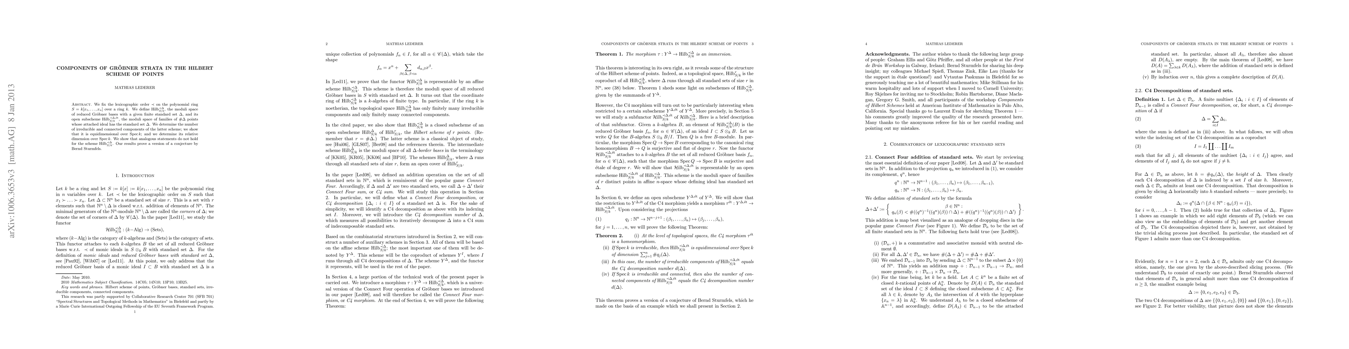 We fix the lexicographic order $\prec$ on the polynomial ring $S=k[x_{1},...,x_{n}]$ over a ring $k$. We define $\Hi^{\prec\Delta}_{S/k}$, the moduli space of reduced Gr\"obner bases with a given finite standard set $\Delta$, and its open subscheme $\Hi^{\prec\Delta,\et}_{S/k}$, the moduli space of families of $#\Delta$ points whose attached ideal has the standard set $\Delta$. We determine the number of irreducible and connected components of the latter scheme; we show that it is equidimensional over ${\rm Spec}\,k$; and we determine its relative dimension over ${\rm Spec} k$. We show that analogous statements do not hold for the scheme $\Hi^{\prec\Delta}_{S/k}$. Our results prove a version of a conjecture by Bernd Sturmfels.