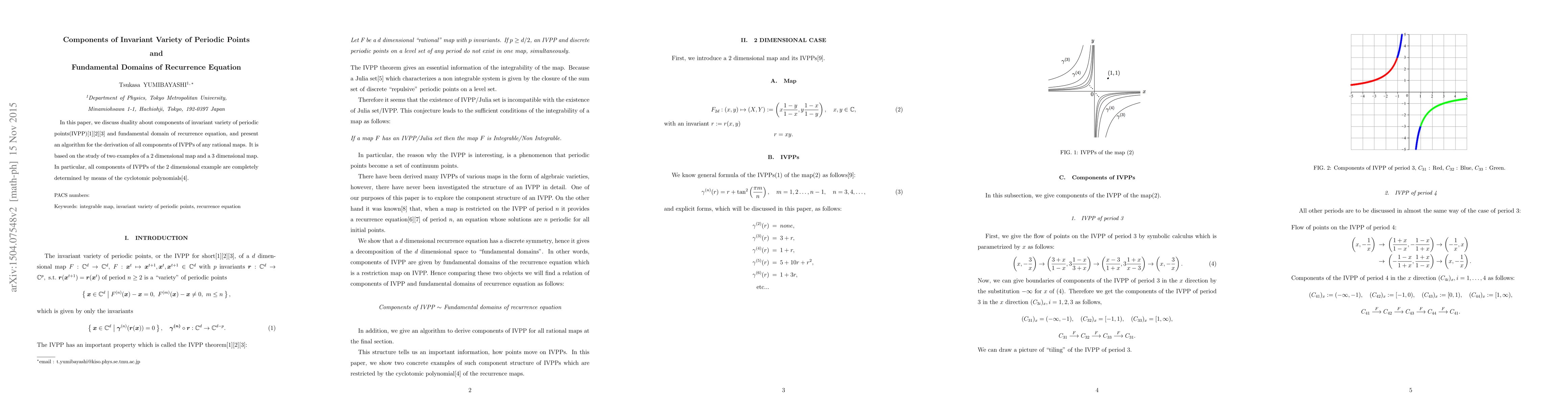 In this paper, we discuss duality about components of invariant variety of periodic points(IVPP) and fundamental domain of recurrence equation, and present an algorithm for the derivation of all components of IVPPs of any rational maps. It is based on the study of two examples of a 2 dimensional map and a 3 dimensional map. In particular, all components of IVPPs of the 2 dimensional example are completely determined by means of the cyclotomic polynomials.