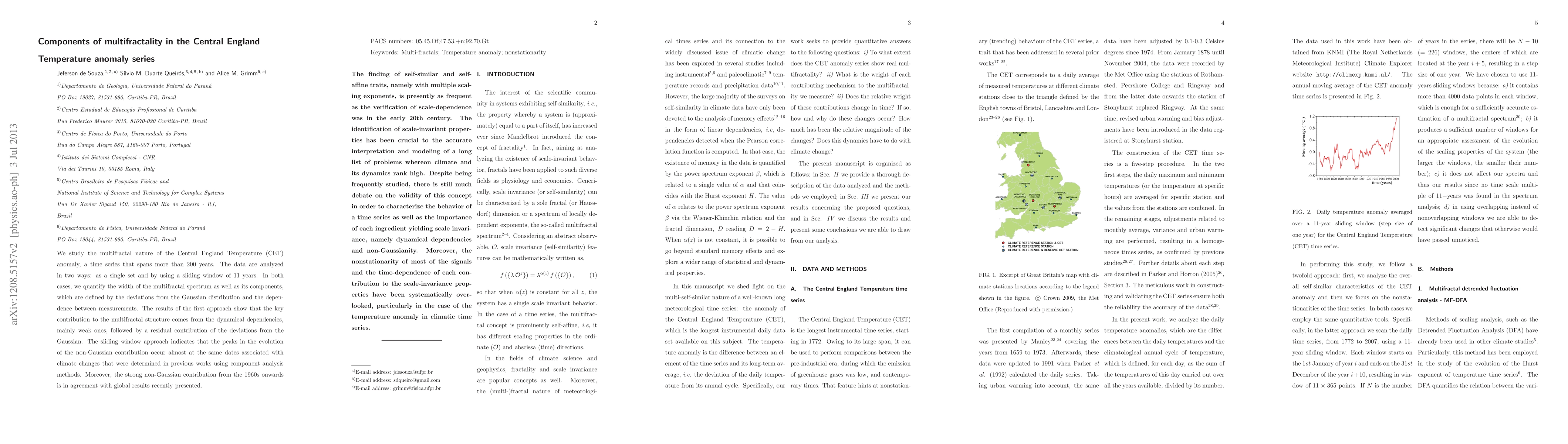 This study investigates the multifractal nature of the Central England Temperature anomaly series, revealing that the primary component of its multifractal structure is due to dynamical dependencies, especially weak ones, with a secondary contribution from deviations from Gaussianity. The sliding window analysis highlights non-Gaussian spikes correlating closely with previously identified climate change dates.