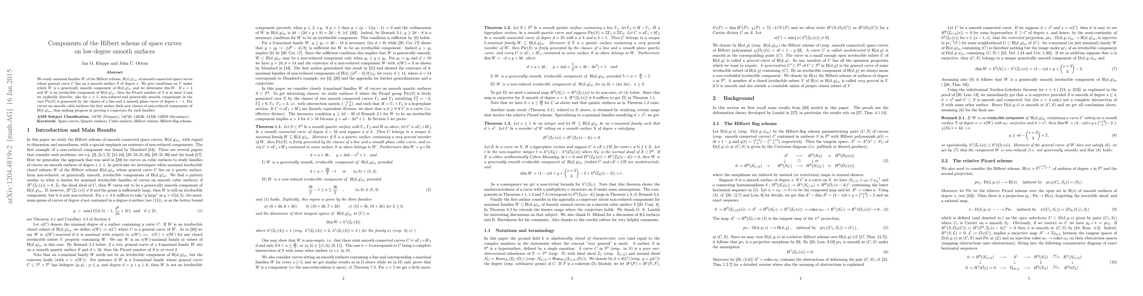 This paper investigates maximal families of smooth connected space curves on low-degree smooth surfaces within the Hilbert scheme, determining conditions for these families to be generically smooth components and calculating their dimensions. It also explores the Picard number of surfaces and identifies new non-reduced components for curves on smooth cubic surfaces, contributing to the proof of a related conjecture.