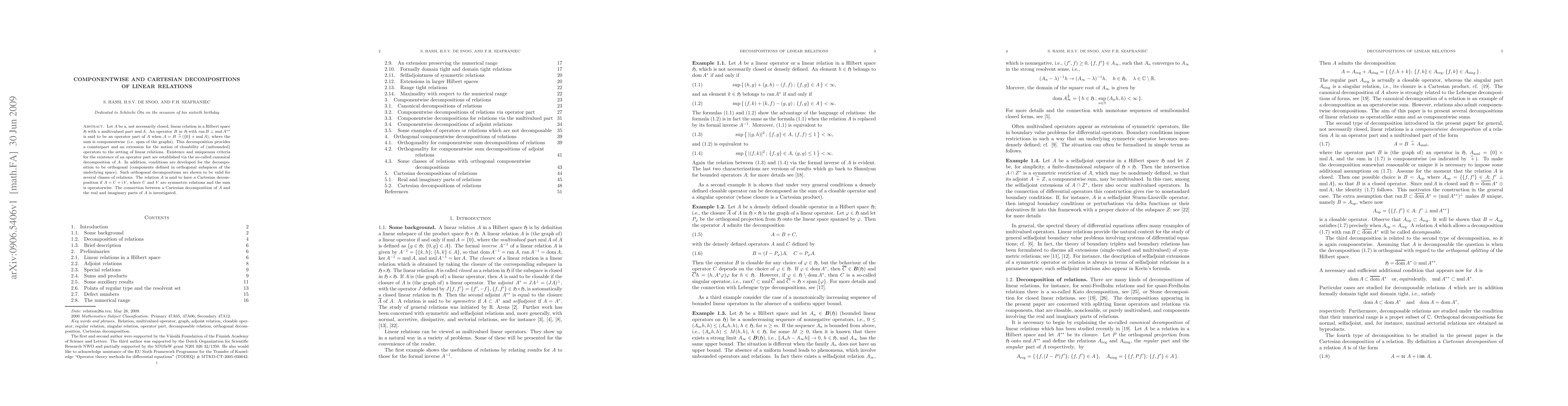 This paper explores decompositions of linear relations in Hilbert spaces, including componentwise and Cartesian decompositions. It establishes criteria for the existence and uniqueness of an operator part and conditions for orthogonal decompositions, showing their validity for various relation classes. It also investigates the connection between Cartesian decompositions and the real and imaginary parts of the relation.