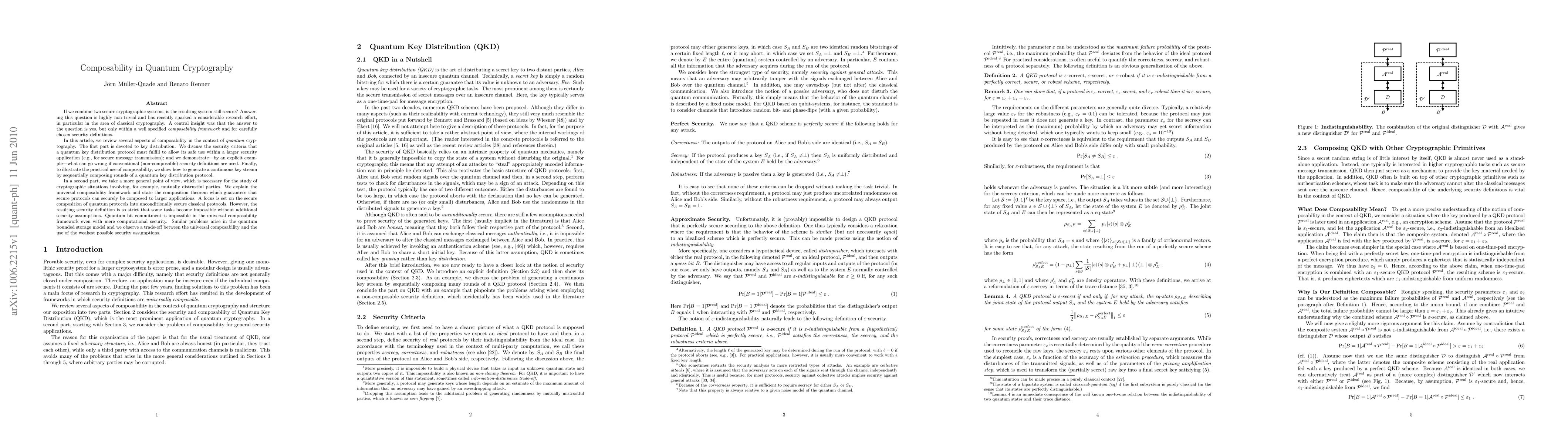 In this article, we review several aspects of composability in the context of quantum cryptography. The first part is devoted to key distribution. We discuss the security criteria that a quantum key distribution protocol must fulfill to allow its safe use within a larger security application (e.g., for secure message transmission). To illustrate the practical use of composability, we show how to generate a continuous key stream by sequentially composing rounds of a quantum key distribution protocol. In a second part, we take a more general point of view, which is necessary for the study of cryptographic situations involving, for example, mutually distrustful parties. We explain the universal composability framework and state the composition theorem which guarantees that secure protocols can securely be composed to larger applications