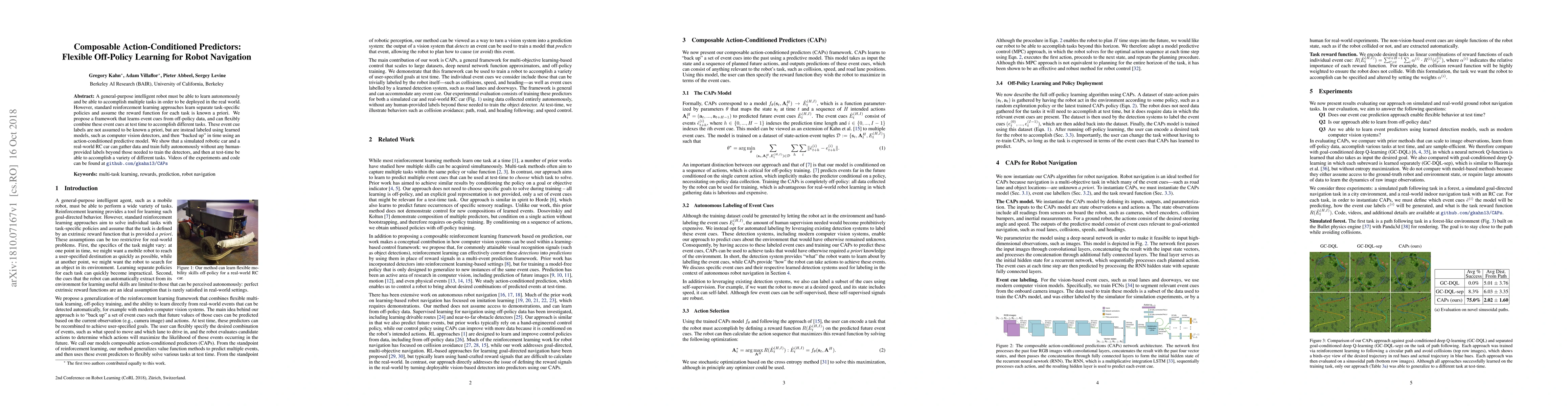 A general-purpose intelligent robot must be able to learn autonomously and be able to accomplish multiple tasks in order to be deployed in the real world. However, standard reinforcement learning approaches learn separate task-specific policies and assume the reward function for each task is known a priori. We propose a framework that learns event cues from off-policy data, and can flexibly combine these event cues at test time to accomplish different tasks. These event cue labels are not assumed to be known a priori, but are instead labeled using learned models, such as computer vision detectors, and then `backed up' in time using an action-conditioned predictive model. We show that a simulated robotic car and a real-world RC car can gather data and train fully autonomously without any human-provided labels beyond those needed to train the detectors, and then at test-time be able to accomplish a variety of different tasks. Videos of the experiments and code can be found at https://github.com/gkahn13/CAPs