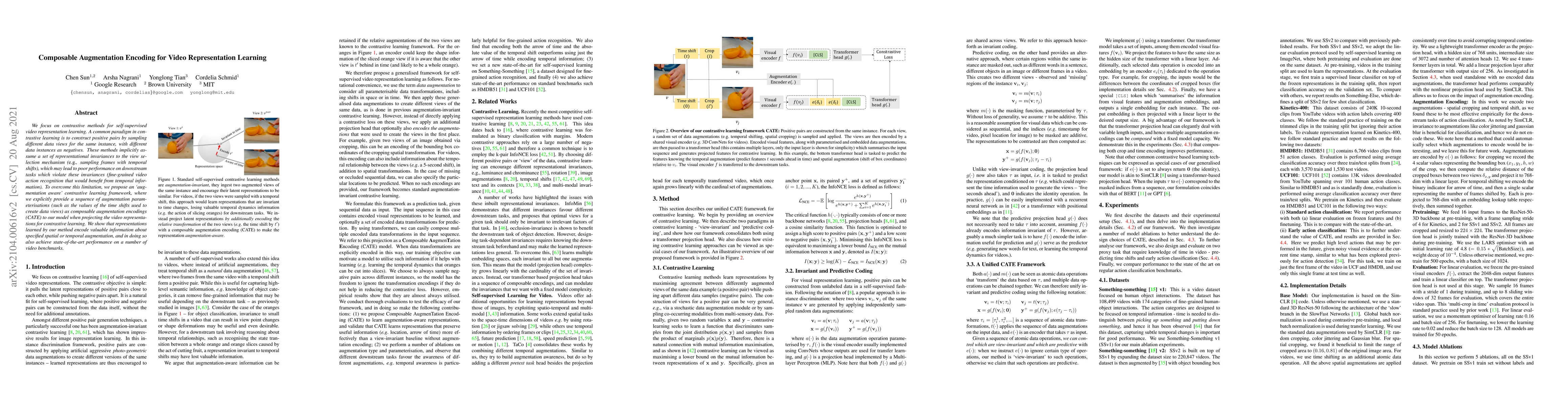 This paper proposes a 'augmentation aware' contrastive learning framework called Composable Augmentation Encoding (CATE) to enhance self-supervised video representation learning. It achieves state-of-the-art performance by explicitly incorporating augmentation parameters into the learning process, enabling better performance on tasks requiring temporal information.