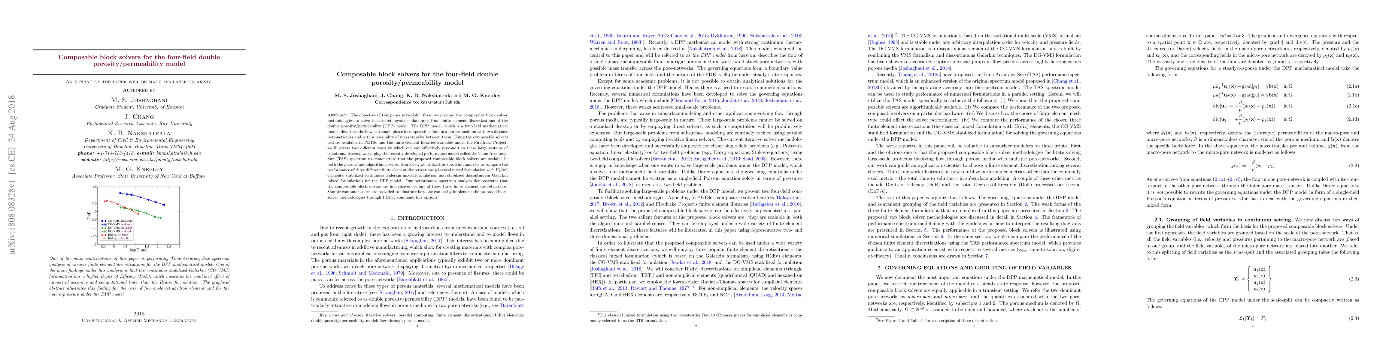 This paper proposes two composable block solver methodologies for solving the four-field double porosity/permeability model using finite element discretizations. It demonstrates scalability through the Time-Accuracy-Size spectrum analysis and shows that the proposed solvers are effective for various finite element discretizations.