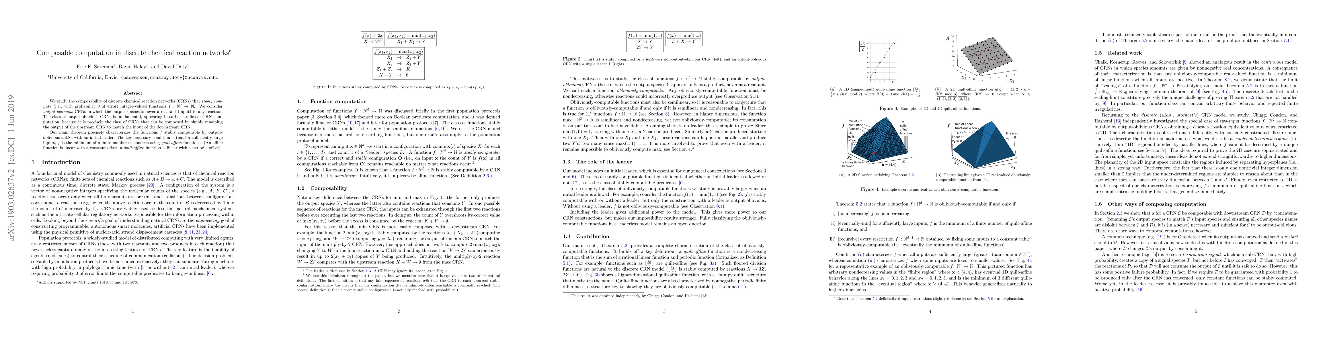 The paper studies composable computation in discrete chemical reaction networks (CRNs) focusing on output-oblivious CRNs that stably compute integer-valued functions with an initial leader.